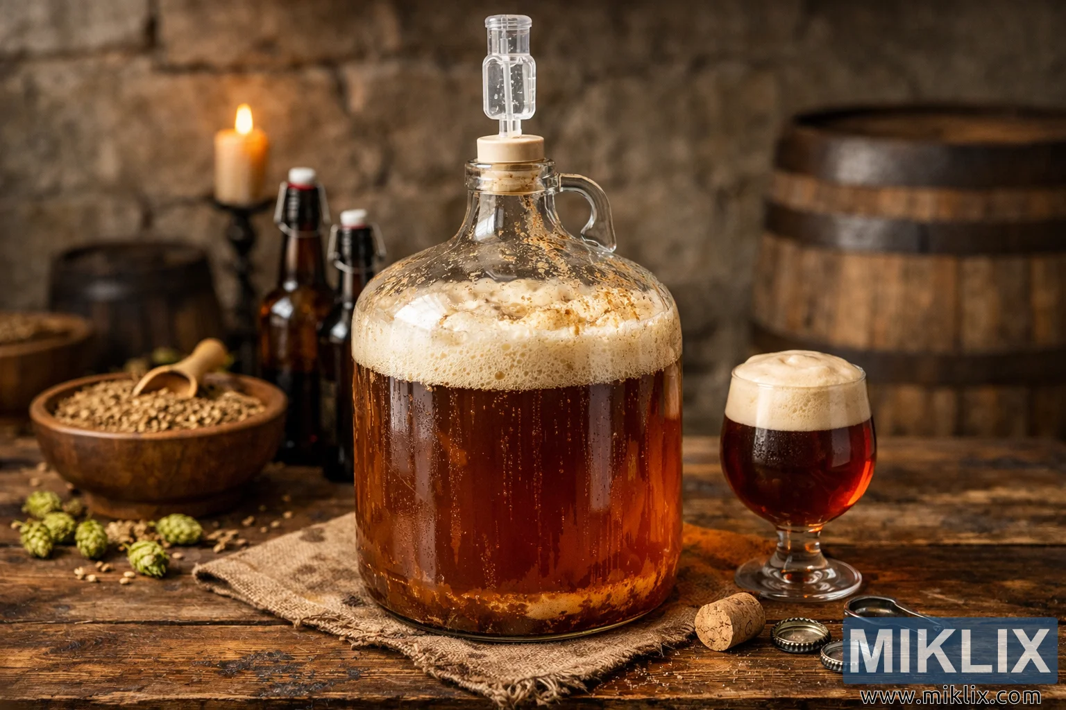 An airlock is fitted snugly into the stopper at the top of the carboy, partially filled with clear liquid, signaling a controlled fermentation process. Around the base of the vessel, the table is adorned with brewing elements that reinforce the artisanal, traditional character of the setting. To the left, a small wooden bowl holds pale malted barley, with a scoop resting inside, while scattered green hop cones lie nearby, their papery texture and fresh color contrasting with the dark wood beneath them. Behind the carboy, a pair of capped brown glass bottles stand slightly out of focus, hinting at the beer’s eventual destination.