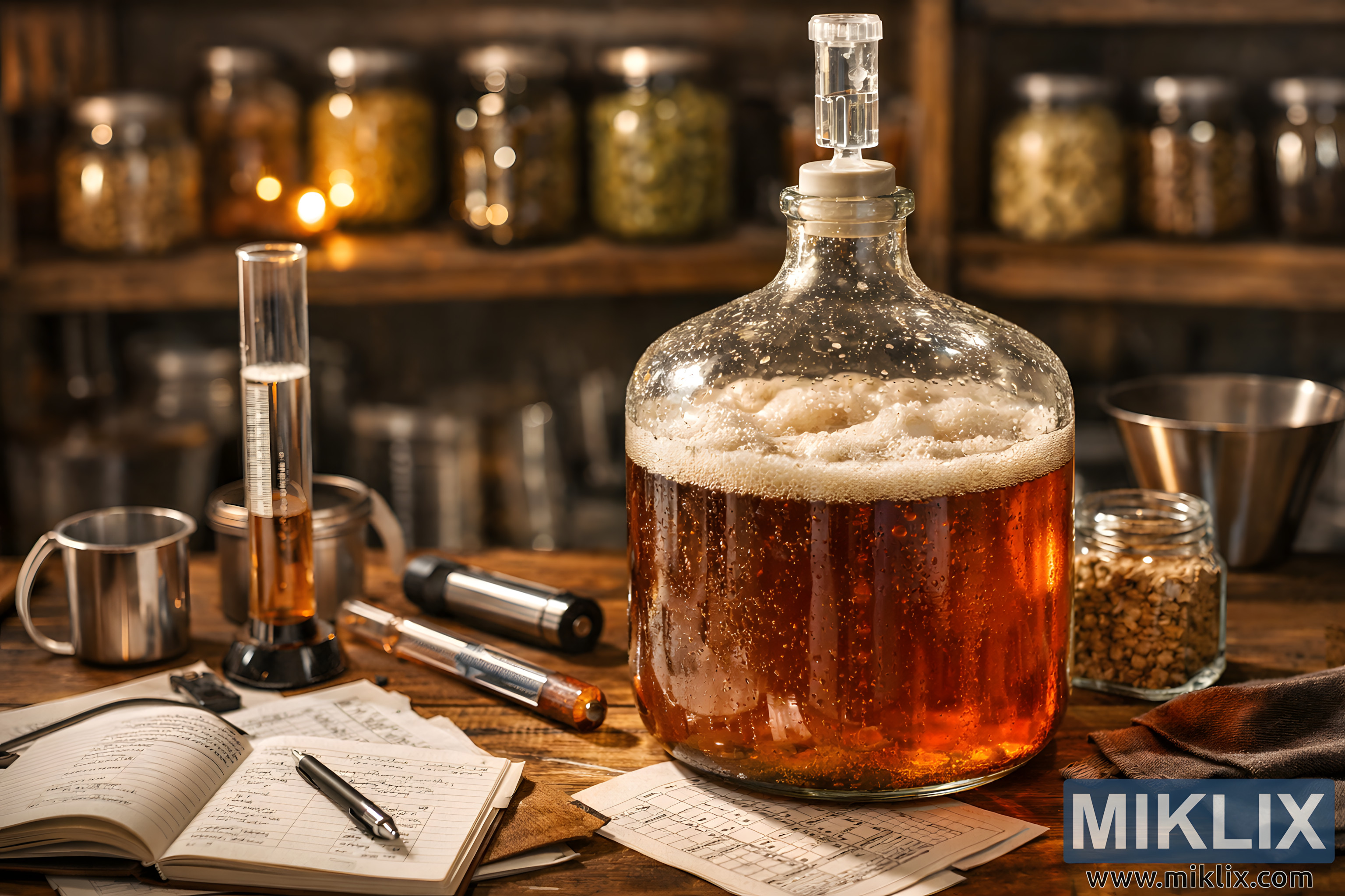 A warm, close-up brewing scene shows an amber beer fermenting in a glass carboy, surrounded by hydrometers, tools, and handwritten notes—an intimate, problem-solving moment in a fermentation chamber setting.
