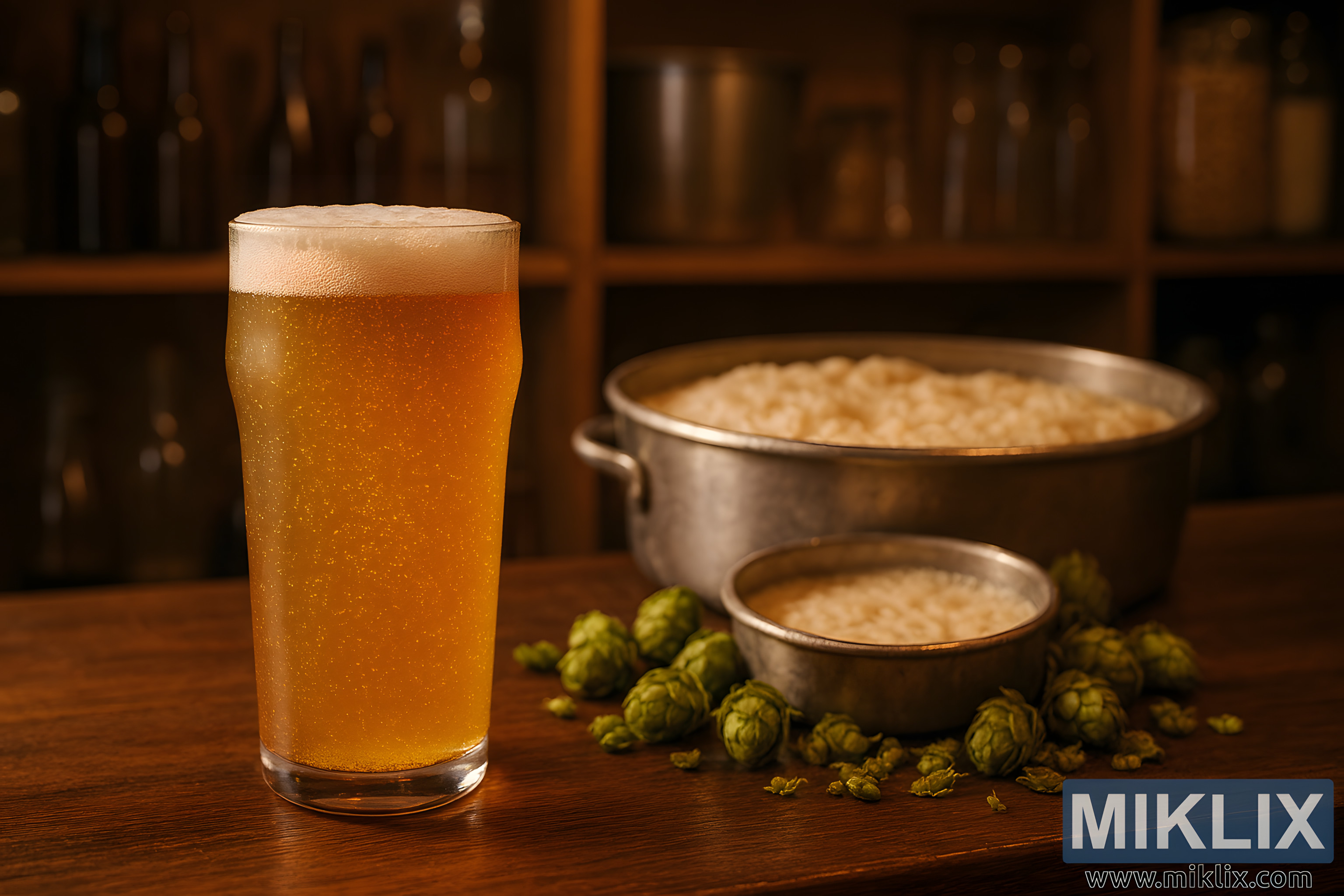 A richly detailed image of a hazy amber beer glass with carbonation, open fermentation vessel, hops, and brewing equipment in a warm, inviting brewery setting.