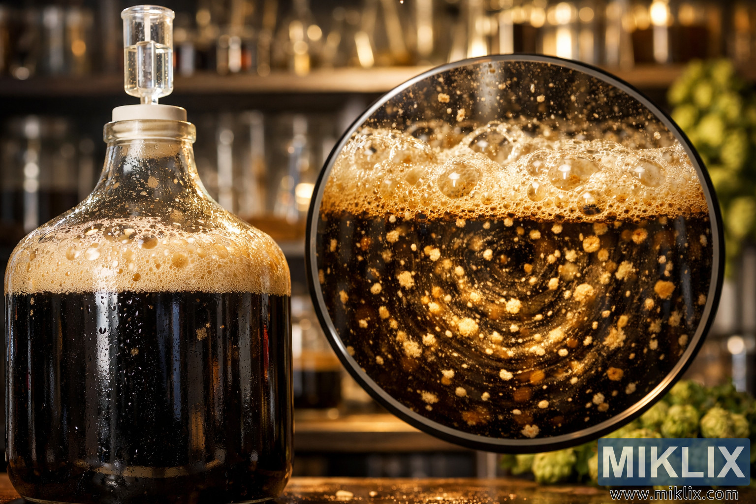 Overall, the image conveys a sense of discovery, patience, and craftsmanship. It bridges the gap between laboratory science and artisanal homebrewing, highlighting fermentation as both a technical and creative process. Crisp focus, controlled lighting, and thoughtful composition work together to celebrate the essence of stout fermentation and the vital role of yeast in shaping beer character.