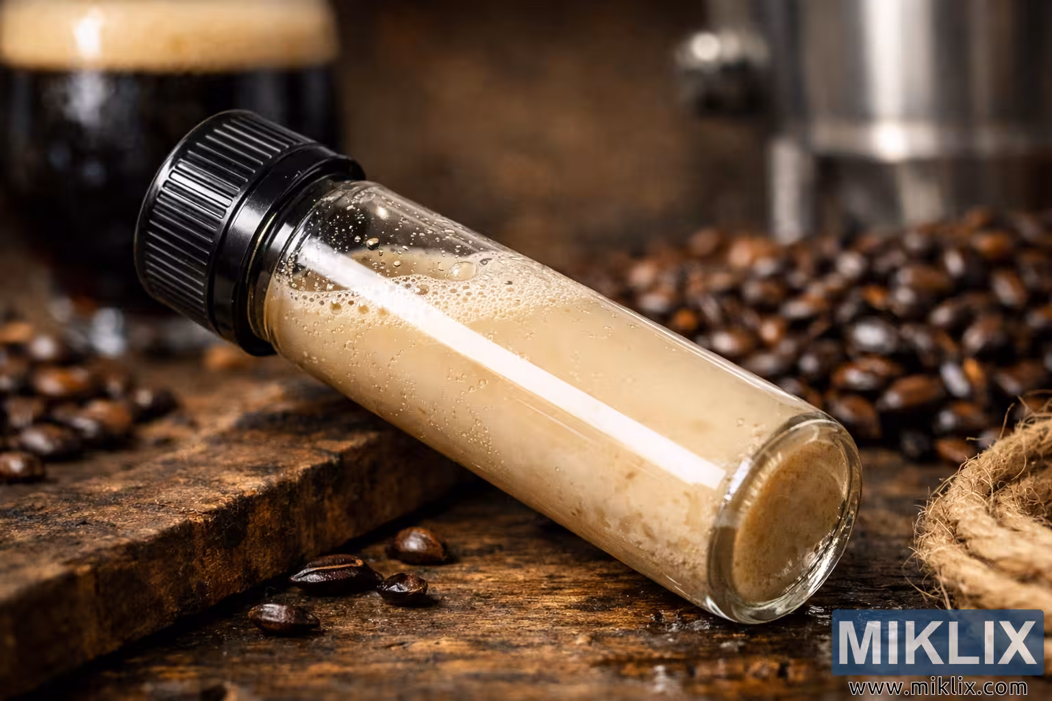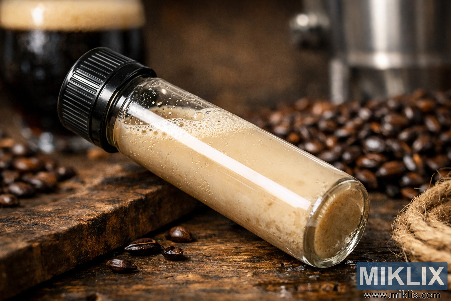 The image presents a highly detailed, close-up photographic scene centered on a small, clear glass vial containing Belgian stout yeast. The vial lies diagonally across a rustic wooden surface, its orientation drawing the viewer’s eye from the textured black screw cap on the left toward the rounded glass base on the right. The glass is pristine and glossy, catching soft highlights that emphasize its smooth curvature and thickness. Inside the vial, a pale beige, slightly cloudy liquid is visible, with a dense layer of settled yeast sediment resting at the bottom. Tiny bubbles cling to the inner walls of the glass, suggesting recent agitation or active fermentation, and adding a sense of realism and liveliness to the otherwise still composition. The vial is intentionally unlabelled, with no text or markings, reinforcing a clean, minimalist aesthetic and allowing the contents and materials to speak for themselves. Surrounding the vial are scattered roasted barley grains, their dark brown, almost espresso-like tones complementing the stout theme and contrasting with the lighter yeast suspension. The barley kernels vary subtly in size and sheen, some matte and some lightly reflective, contributing to a tactile, grounded feel. In the softly blurred background, a stout beer glass can be discerned, its dark body and creamy tan head out of focus but instantly recognizable, reinforcing the brewing context without distracting from the main subject. Additional brewing equipment appears as indistinct metallic shapes further back, rendered with a shallow depth of field that keeps attention firmly on the vial. The lighting is warm and inviting, with amber and honey tones that enhance the wood grain and enrich the color palette of browns, creams, and blacks. Shadows are gentle and controlled, creating depth without harsh contrast. The overall mood is artisanal and intimate, evoking the craft of brewing, patience, and careful handling of ingredients. The composition balances technical clarity with atmospheric softness, resulting in an image that feels both scientific and handcrafted, suitable for editorial, educational, or promotional use within the brewing and fermentation world.