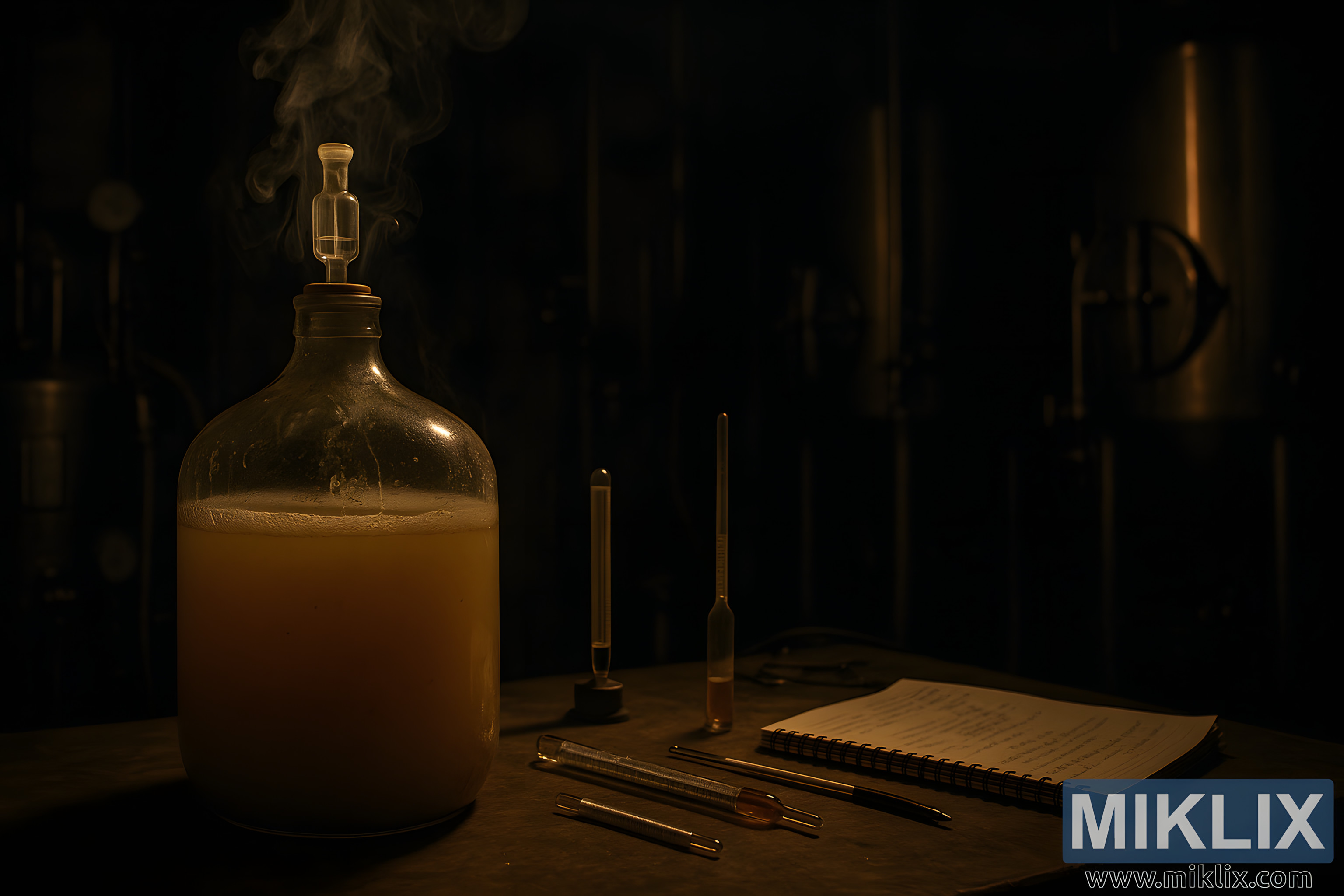 Spread across the workbench are various brewing tools that reinforce the technical, investigative mood of the scene. A hydrometer lies carefully on its side, its slender form catching a sliver of warm light. Nearby, a tall thermometer stands upright, its mercury-filled tube reflecting the soft glow. Several pipettes and testing vials rest haphazardly across the surface, as though recently used during a hurried diagnostic analysis. A spiral-bound notebook—its pages filled with hurried, handwritten notes—sits half open, implying that the brewer has been documenting observations, troubleshooting inconsistencies, and identifying possible causes for the fermentation issue.