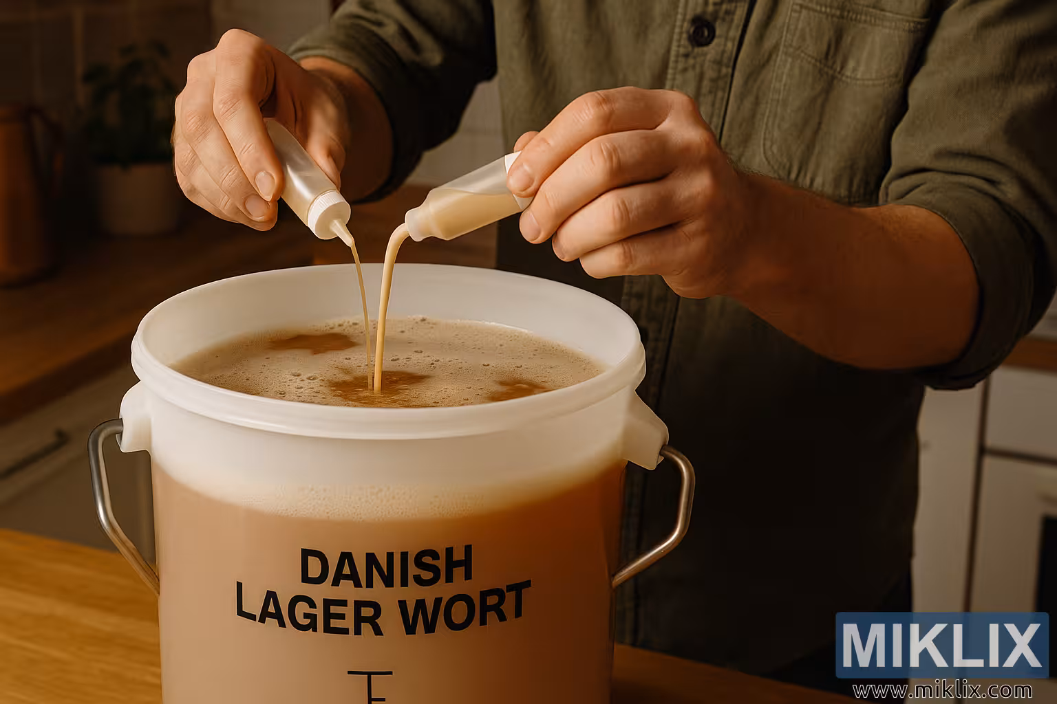 A warm, close-up image of a homebrewer adding liquid yeast to a fermentation vessel filled with Danish lager wort in a cozy brewing space.