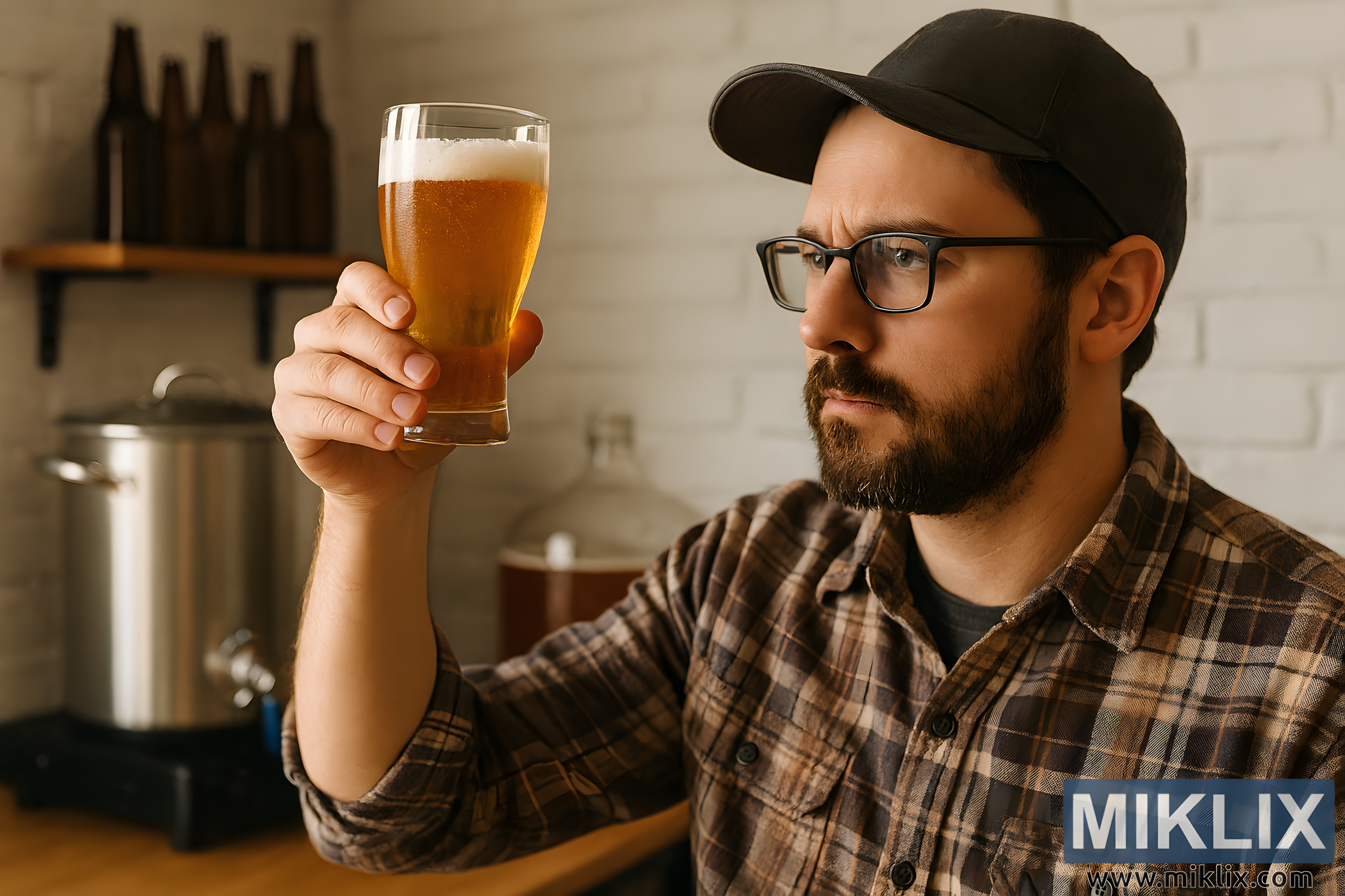 A focused homebrewer examines a glass of California lager in a cozy brewing space with stainless steel equipment and warm lighting.