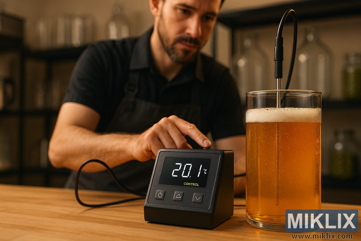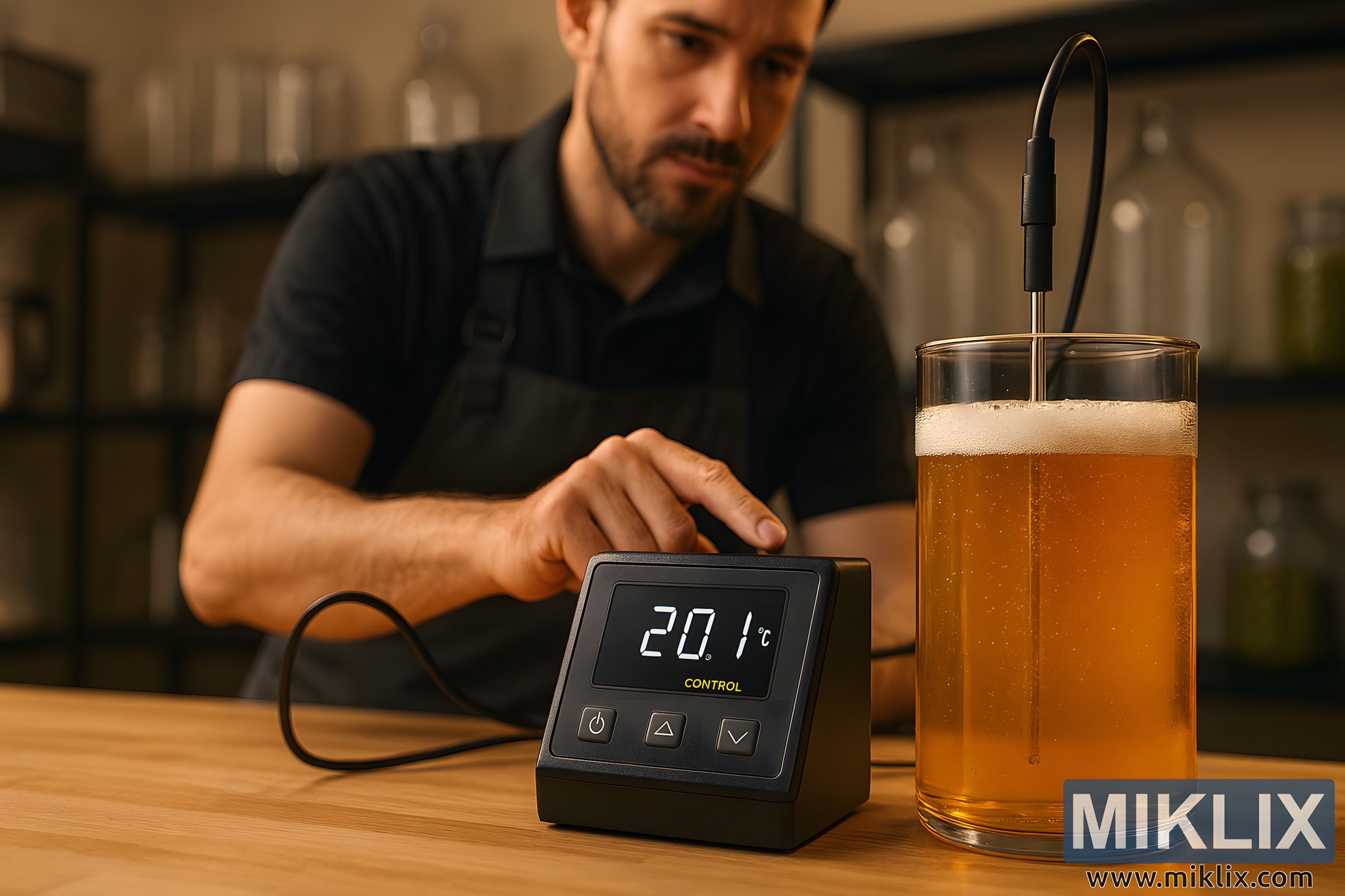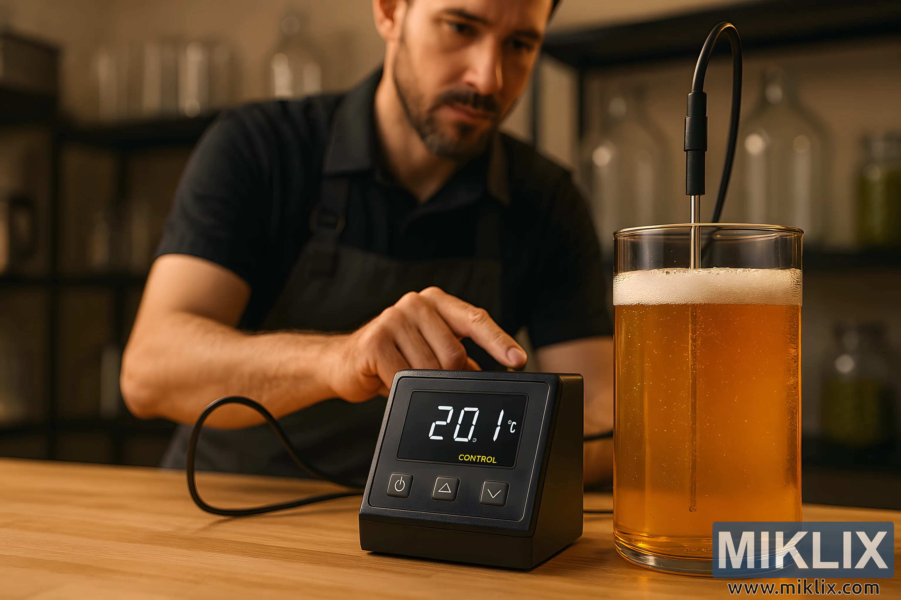 A professional brewer monitors fermentation temperature using a high-tech controller beside a golden lager vessel, with brewing equipment in the background and warm ambient lighting.