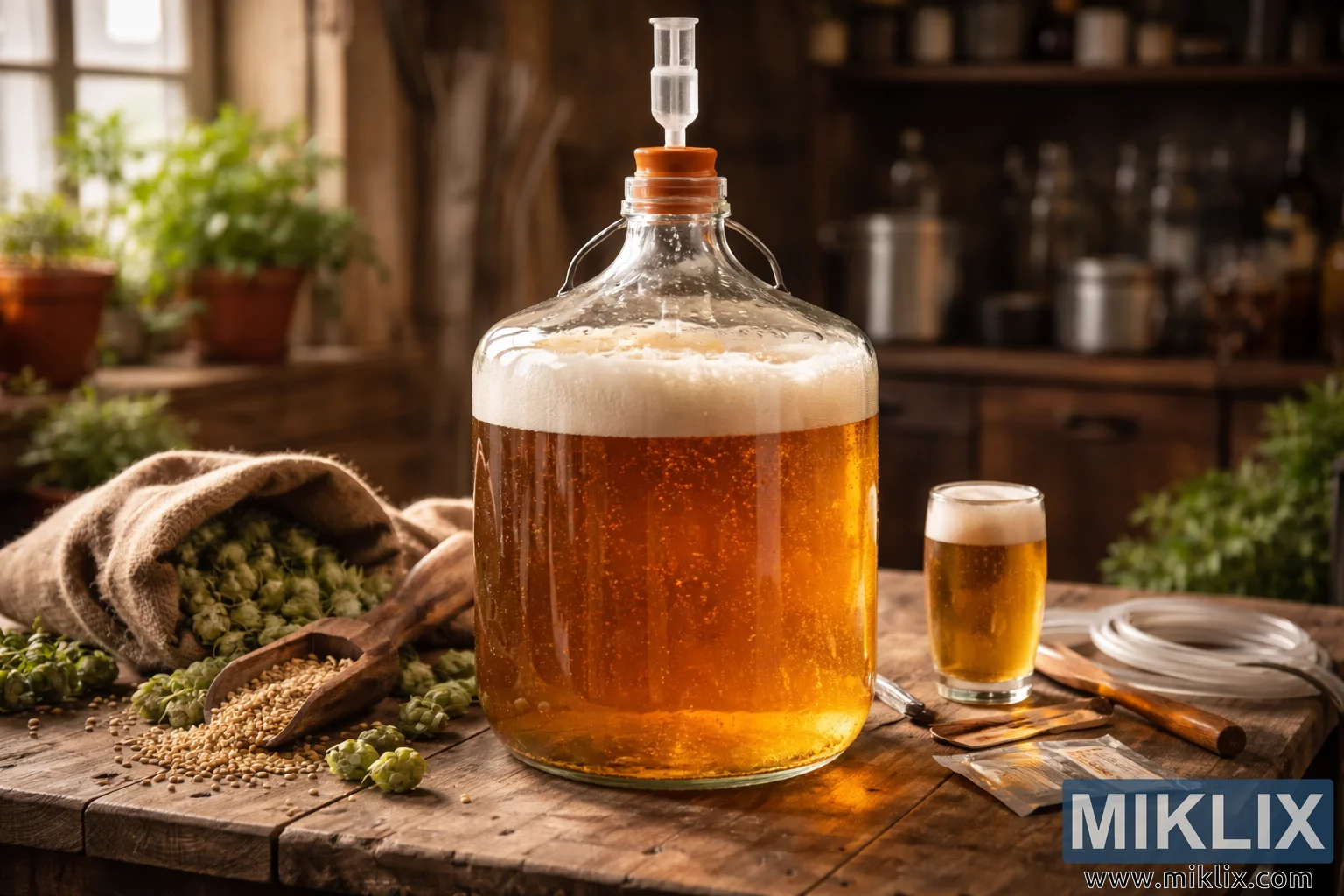 High-resolution landscape photo of a Bohemian lager fermenting in a glass carboy on a rustic wooden table, surrounded by hops, grains, and homebrewing equipment in warm natural light.