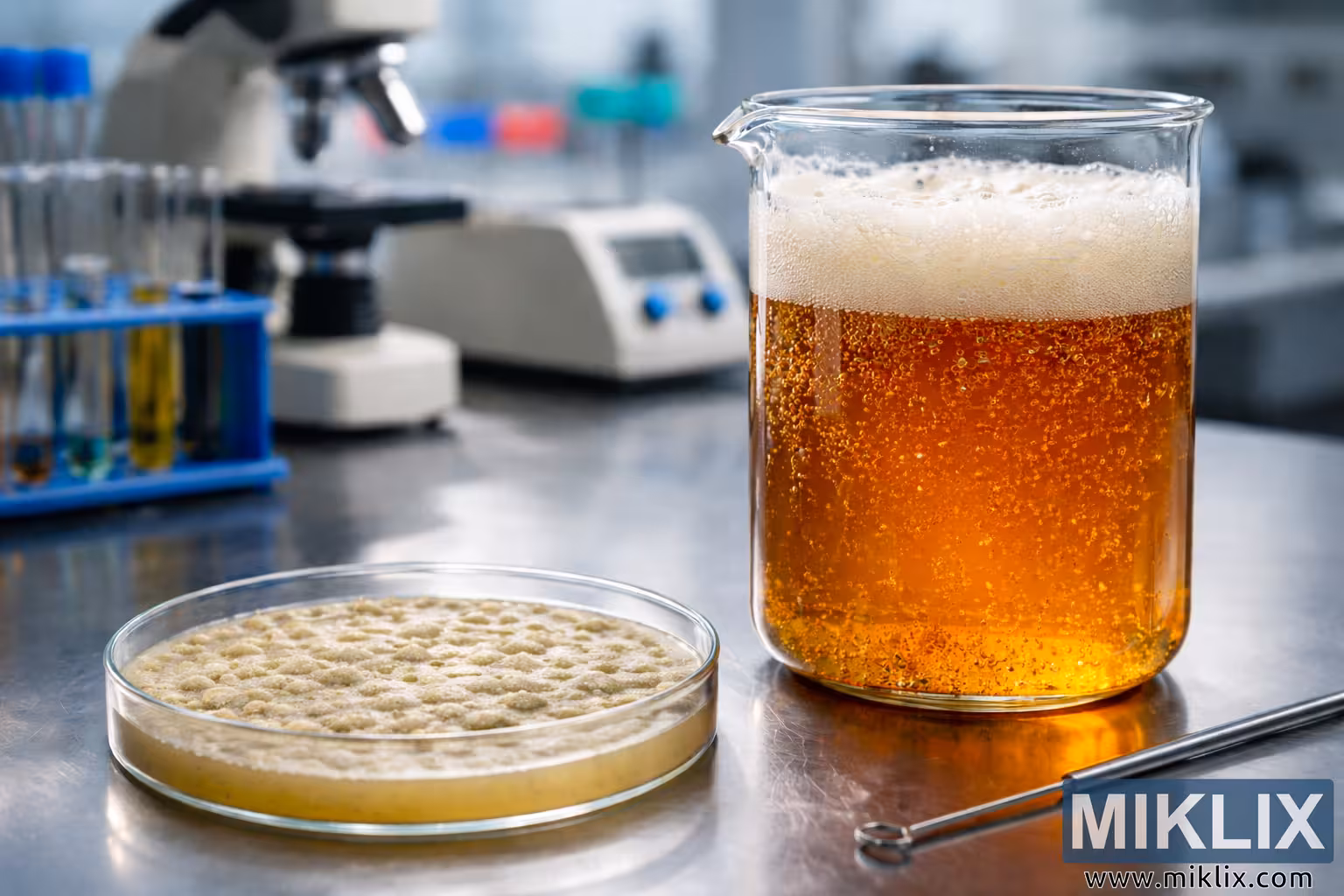 High-resolution laboratory photograph of a glass beaker with actively fermenting beer next to a petri dish containing yeast culture, set against blurred scientific equipment.