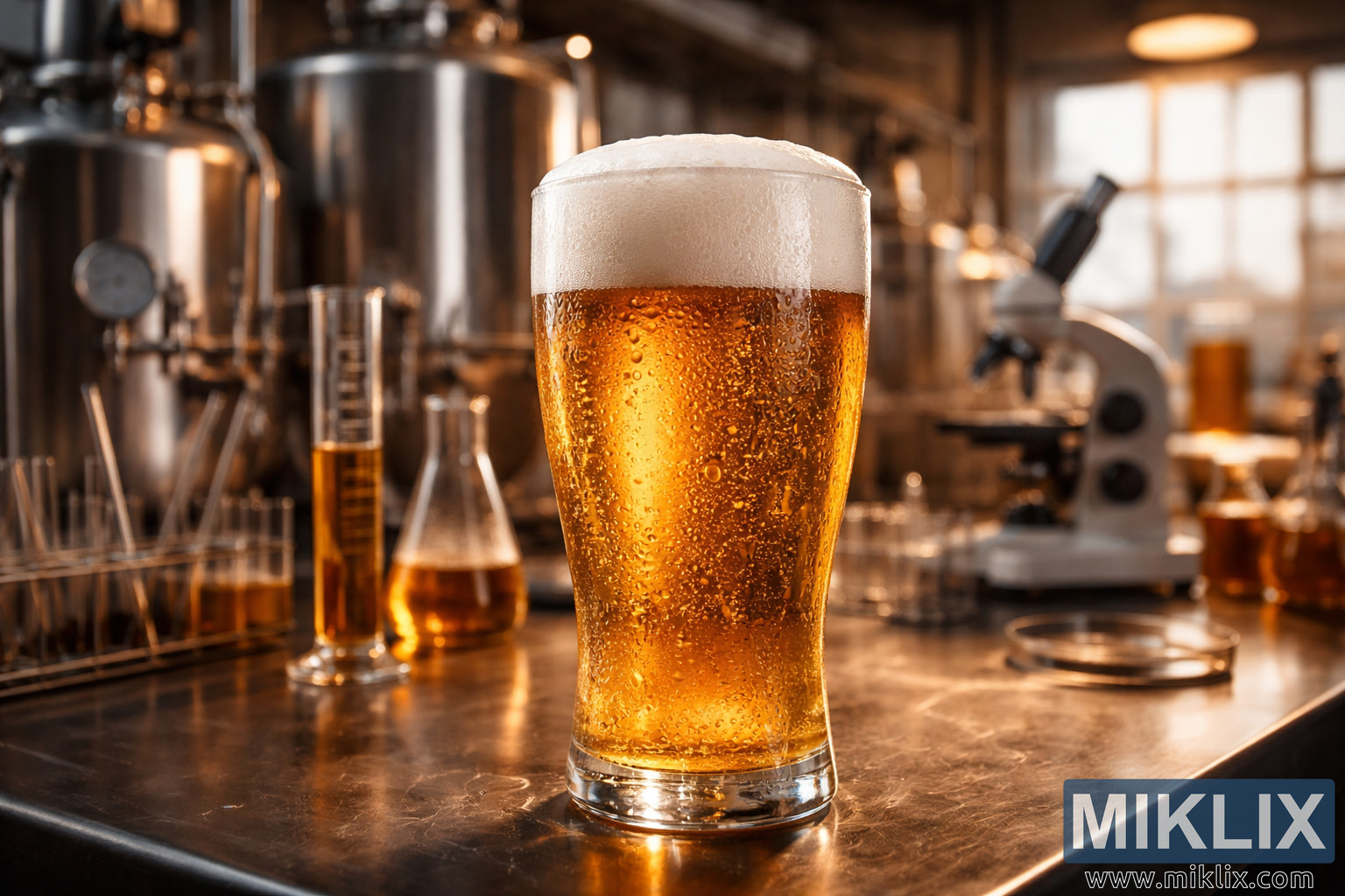 Detailed close-up photograph of a golden lager beer with a frothy head in a laboratory brewery setting, featuring fermentation vessels and scientific tools in warm light.