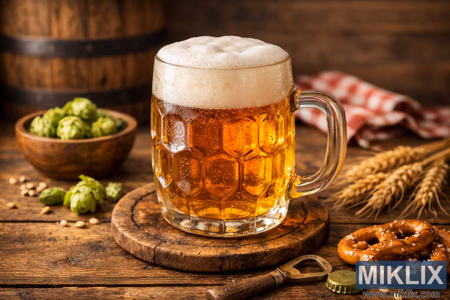 High-resolution landscape photo of a frosty Czech-style lager in a traditional glass mug on a rustic wooden table, surrounded by hops, barley, pretzels, and warm brewery-inspired details.