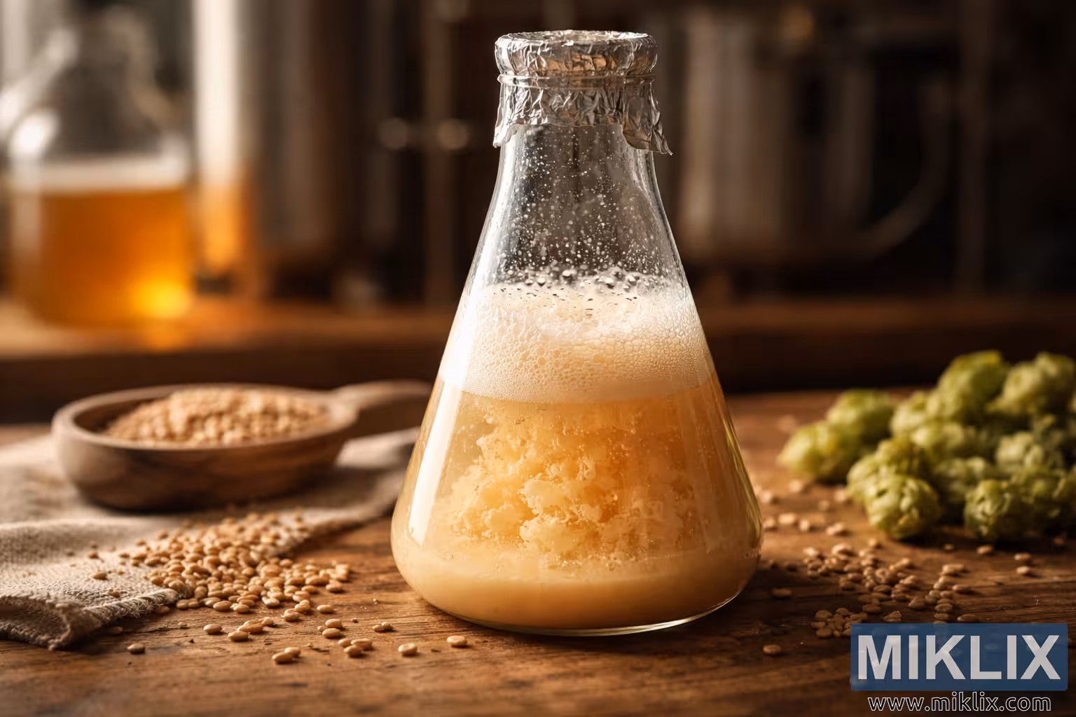 Detailed close-up photograph of a freshly prepared liquid yeast starter bubbling inside a glass flask, set on a wooden table with malt grains and hops, illuminated by warm, diffused light in a brewing environment.