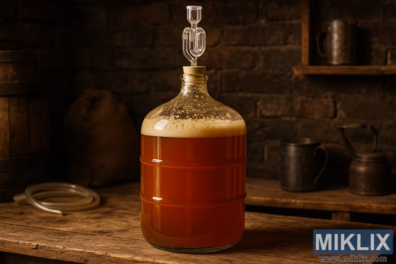 On the right side of the composition, resting on a simple wooden shelf and work surface, are various metal vessels: pitchers, jugs, and containers, each with a patina that tells of long service in this brewing environment. Their matte gray finish contrasts with the warmth of the fermenting beer, while also reinforcing the utilitarian, no-frills character of a home workshop. The wall behind is made of dark, rough-textured brick, exuding both solidity and an old-world charm. The dimly lit backdrop further emphasizes the amber glow of the fermenter, making it the undeniable focal point of the image.