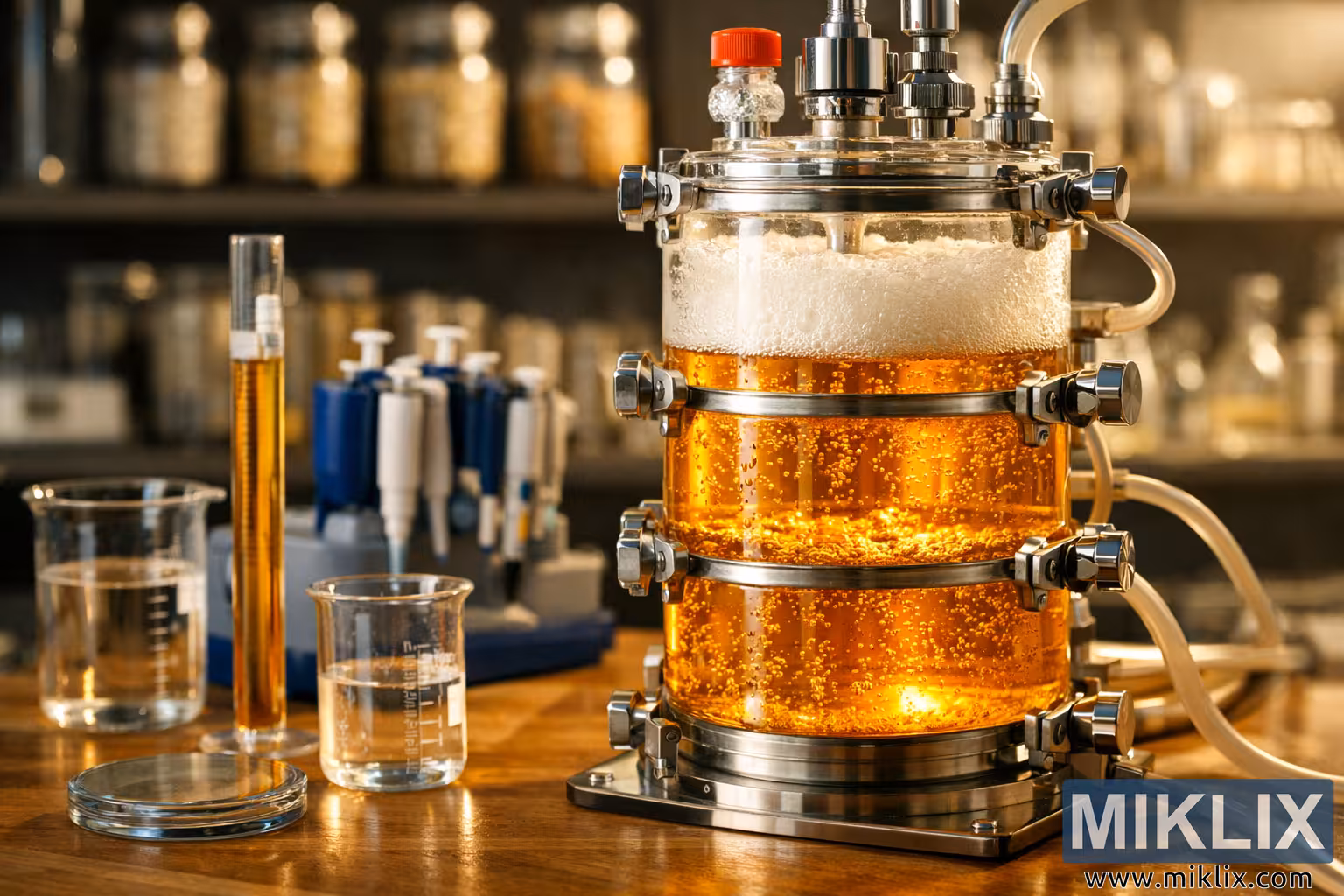 A professional laboratory scene featuring a multi-chamber fermentation vessel filled with golden lager, scientific glassware, and yeast samples, highlighting the precision and craftsmanship of the brewing process.
