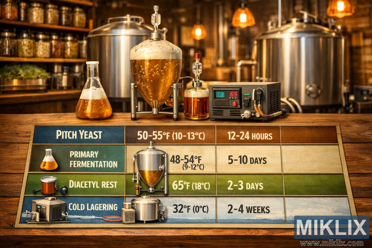 Image: Lager Fermentation Schedule Infographic in a Warm Brewery Setting