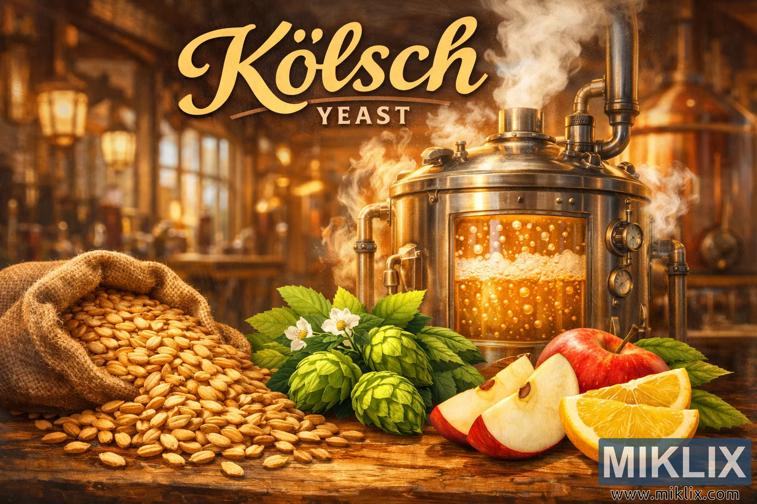 Overall, the mood is vibrant, inviting, and craft-focused. The illustration balances rustic charm with technical precision, celebrating both the artistry and science of brewing. It evokes the enthusiasm of homebrewers and professionals alike, visually translating aroma and flavor into color, texture, and light, and presenting Kölsch yeast as the heart of a lively, elegant brewing experience.