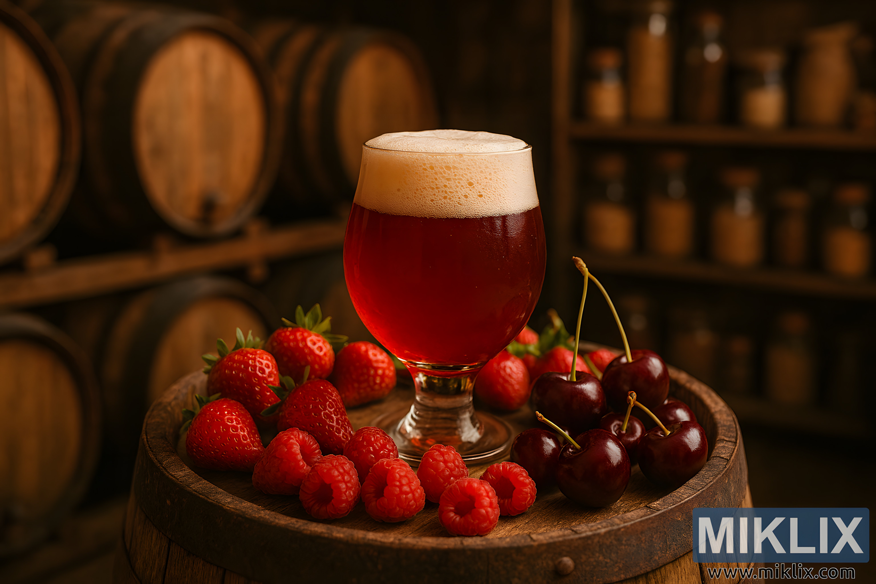 Explore a cozy brewery setting featuring a fruit-laden sour beer, oak barrels, and warm ambient lighting.