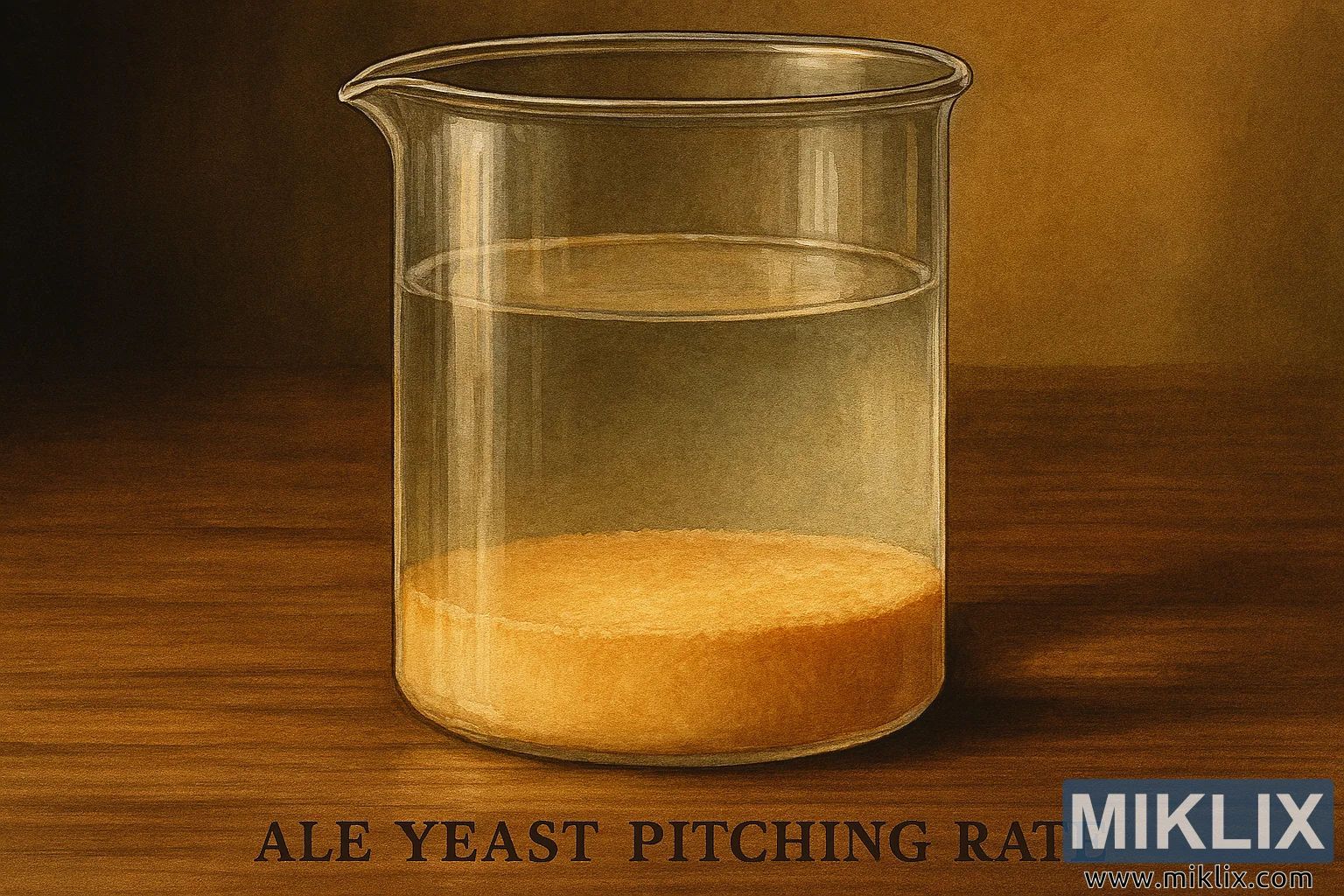 High-resolution illustration of ale yeast pitching rate, featuring a clear glass container with sediment on a wooden surface in warm lighting.