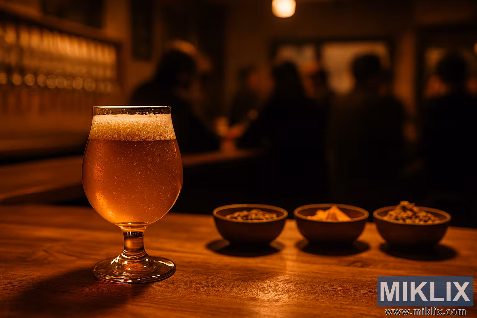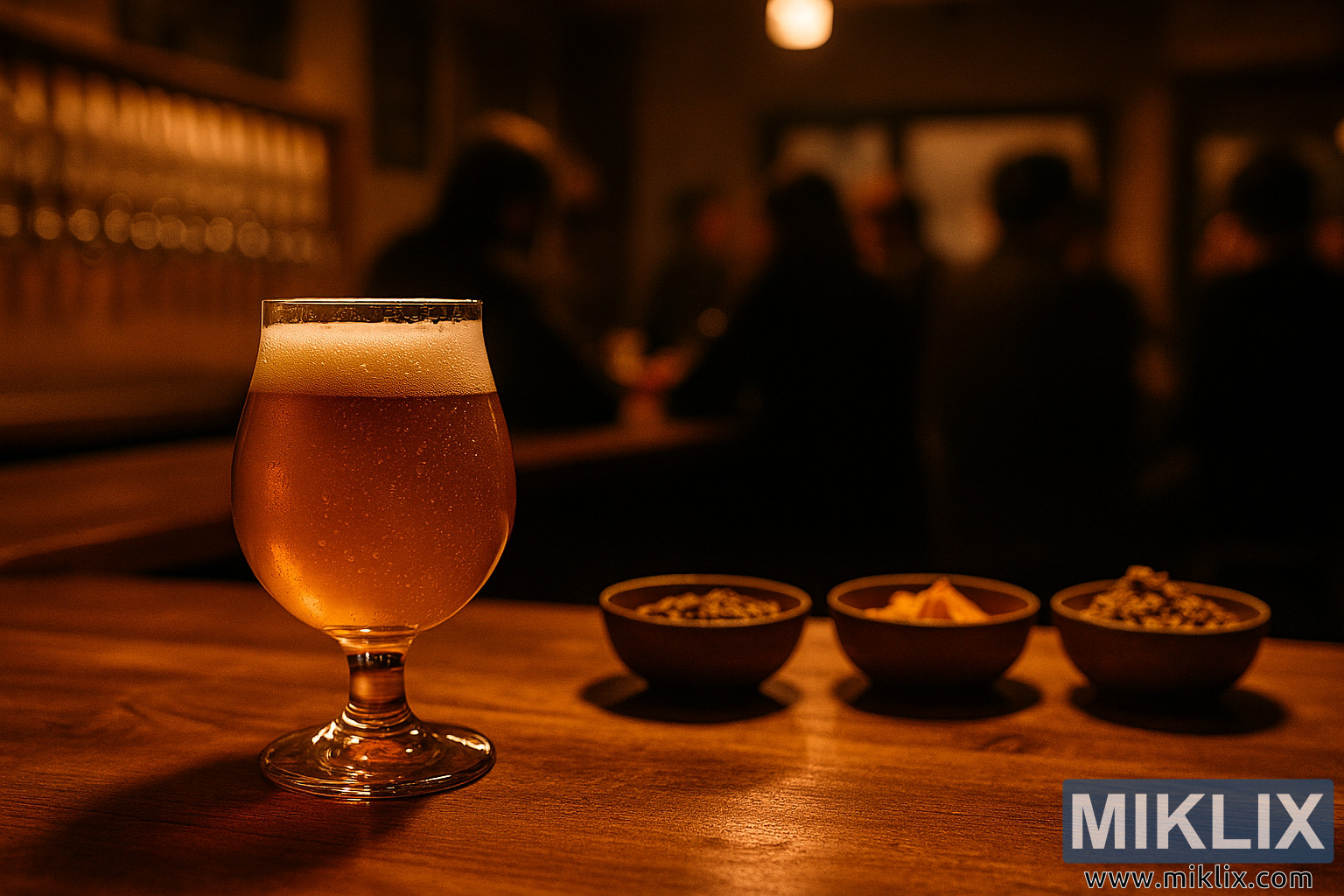 In the softly blurred background, shadowy figures engage in hushed conversation, their silhouettes partially illuminated by the ambient glow of wall-mounted beer taps. The patrons, dressed in dark clothing, lean in toward one another, creating an atmosphere of quiet appreciation and shared curiosity. The taproom’s interior — lined with wooden shelves and subtle architectural details — reinforces the artisanal nature of the setting. The lighting is intentionally subdued, allowing the golden hues of the beer and the warm tones of the wood to dominate the visual palette.