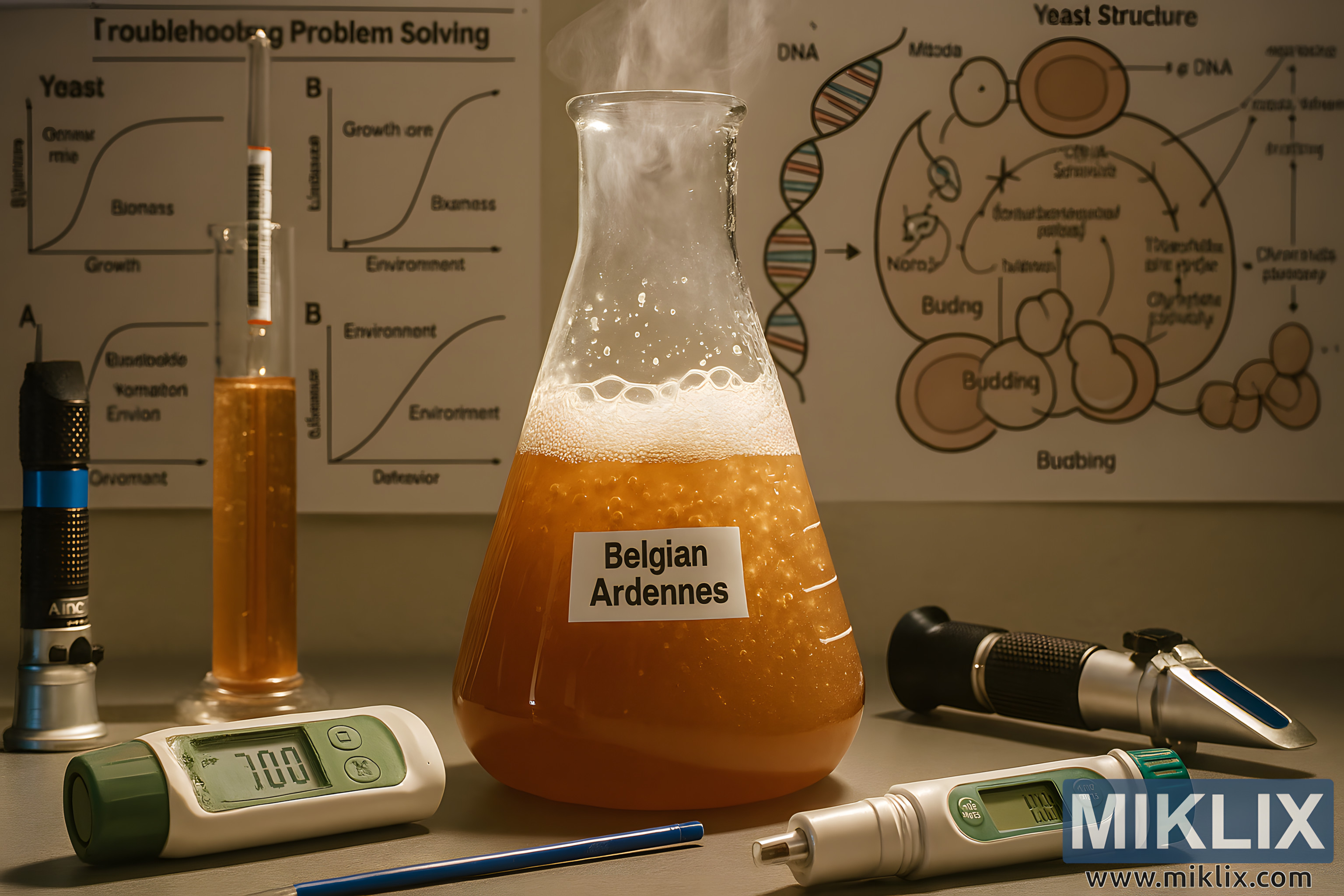High-resolution lab photo featuring Belgian Ardennes yeast fermentation with brewing tools and yeast diagrams