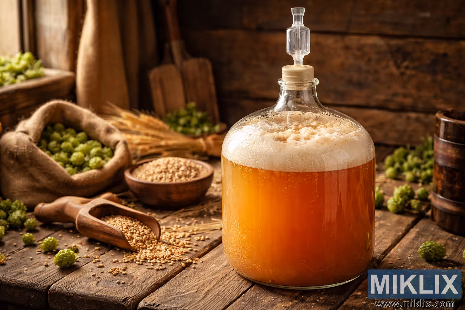 Warm, rustic homebrewing scene featuring a glass carboy of hazy Bavarian wheat ale actively fermenting with foamy krausen and an airlock, set on a wooden table with hops and grains.