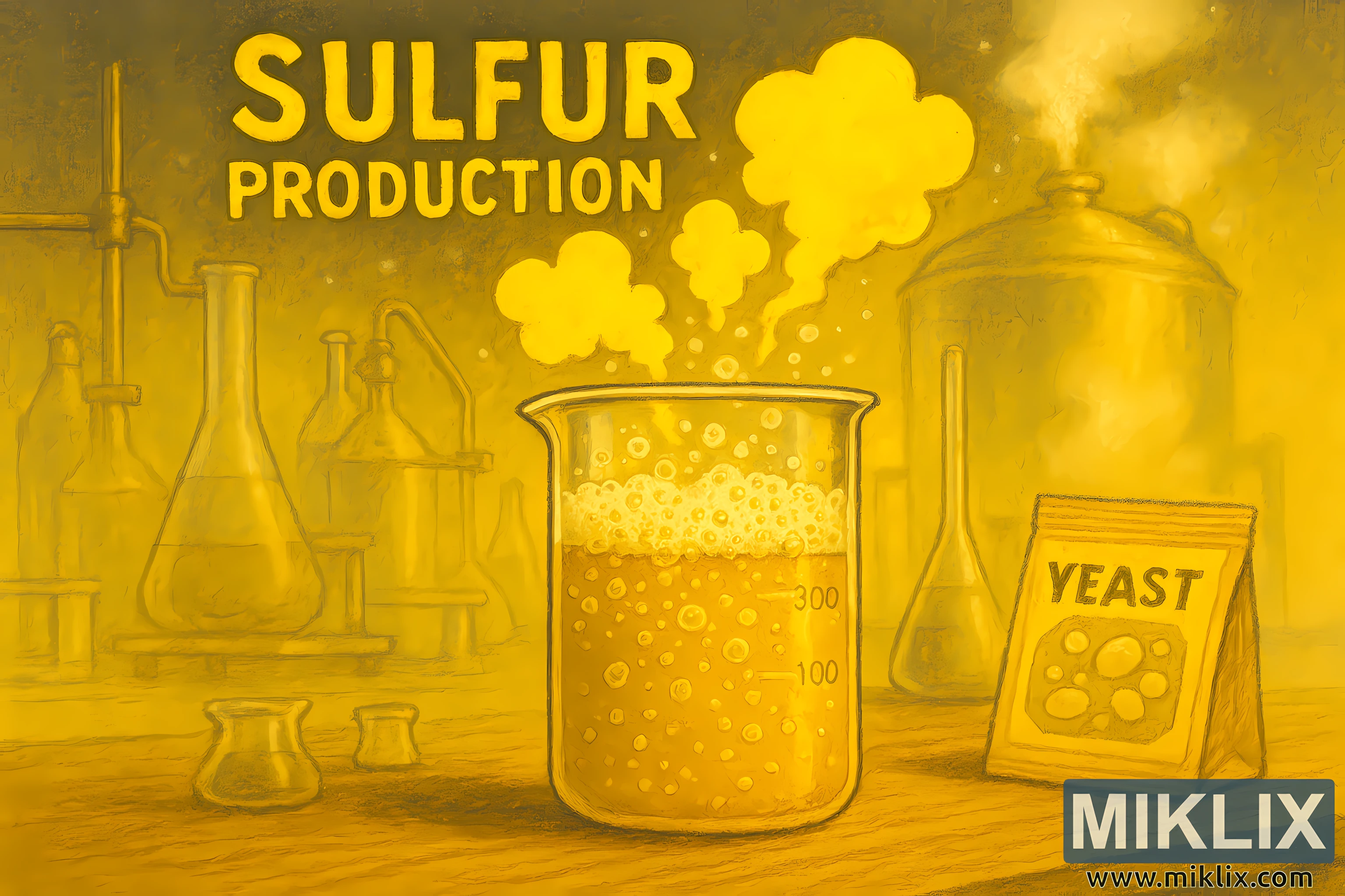 Above the beaker, three stylized sulfur clouds rise in bright yellow, outlined in a deeper shade to convey gaseous diffusion. These clouds are both symbolic and illustrative, drawing attention to the sulfuric aspect of fermentation. Hovering above the lab setup, the bold text "SULFUR PRODUCTION" is rendered in textured capital letters, matching the sulfur clouds in color and style, anchoring the theme visually and conceptually.