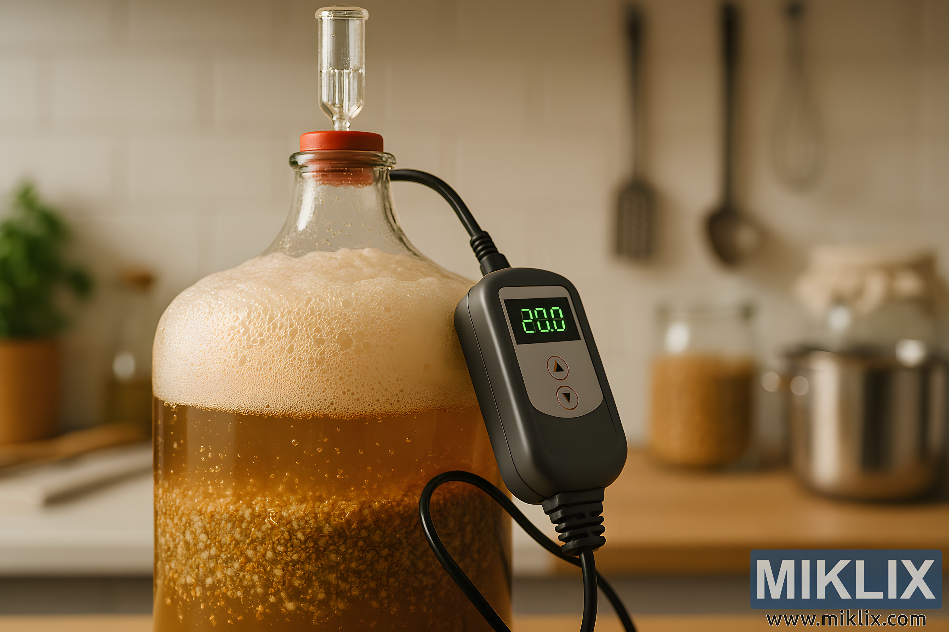 Attached to the side of the carboy is a digital temperature control device. The controller features a compact, rectangular casing with a black front panel and a small LED display showing the current fermentation temperature of “20.0°C” in bright green digits. Below the display are two red arrow buttons for adjusting the temperature, framed by a subtle red border. A black cable extends from the device, wrapping around the neck of the carboy and disappearing out of frame, suggesting integration with a heating or cooling element.