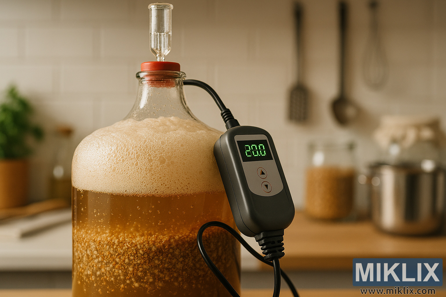 The composition uses a shallow depth of field to isolate the fermenter and its components, drawing the viewer’s attention to the krausen and temperature controller while allowing the background elements to contribute context without distraction. The overall scene conveys expertise in homebrewing, highlighting both the technical and artisanal aspects of fermentation. It evokes a sense of dedication, cleanliness, and mastery, ideal for educational, promotional, or catalog use in brewing-related content.