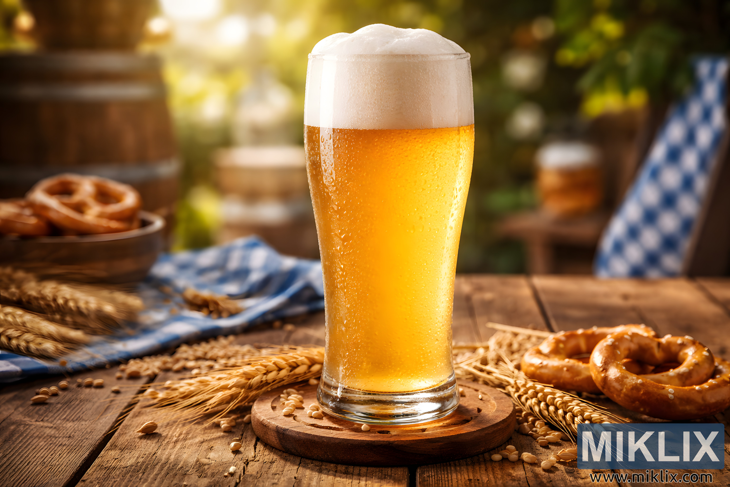 A golden Bavarian wheat beer sits chilled on a rustic wooden table, crowned with creamy foam and framed by pretzels, wheat, and a blue-and-white cloth in a sunlit beer-garden setting.