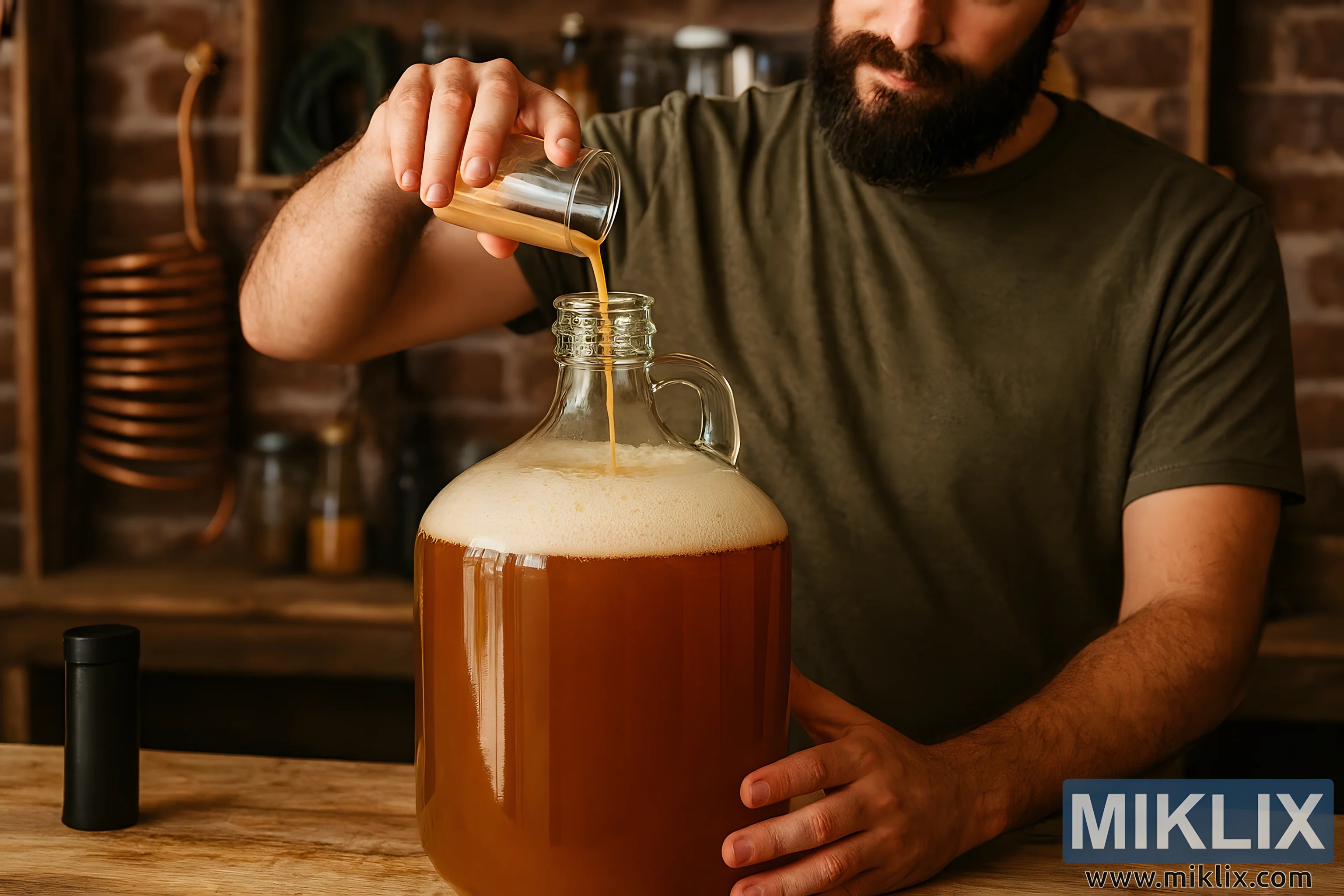 This image captures the essence of artisanal brewing: the hands-on care, the rustic charm of a home setup, and the scientific precision of fermentation. It’s a moment of transformation, where biology meets tradition, and where a simple act—pouring yeast—sets the stage for a complex and flavorful beer to emerge.
