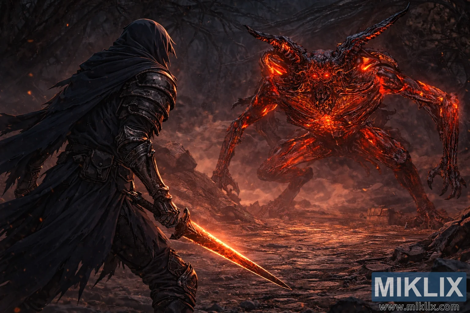 Filmska ilustracija fantazije u anime stilu prikazuje trenutak nabijene mirnoće neposredno prije monumentalnog sukoba između usamljenog oklopljenog ratnika i kolosalne demonske zvijeri. Pogled je postavljen malo iza i lijevo od Potamnjelog, stvarajući perspektivu preko ramena koja gledaoca direktno uvlači u sukob. Ratnik dominira prednjim planom lijevo, djelimično okrenut od gledaoca tako da su vidljivi samo strana kacige i slojevita silueta tamnog oklopa. Pocijepana tkanina s dugog ogrtača vuče se unazad, rubovi su mu iskidani i iznošeni vjetrom, što sugerira bezbroj prethodnih bitaka. Sam oklop je tamno mat crne boje sa slabim metalnim odsjajima koji hvataju vatrene refleksije okoline, dok mač koji se drži nisko u desnoj ruci svijetli rastopljenim narandžastim rubom, osvjetljavajući tlo tankom trakom svjetlosti. Stav Potamnjelog je napet, ali kontroliran, koljena blago savijena, a ramena ispravljena, komunicirajući spremnost bez agresije.