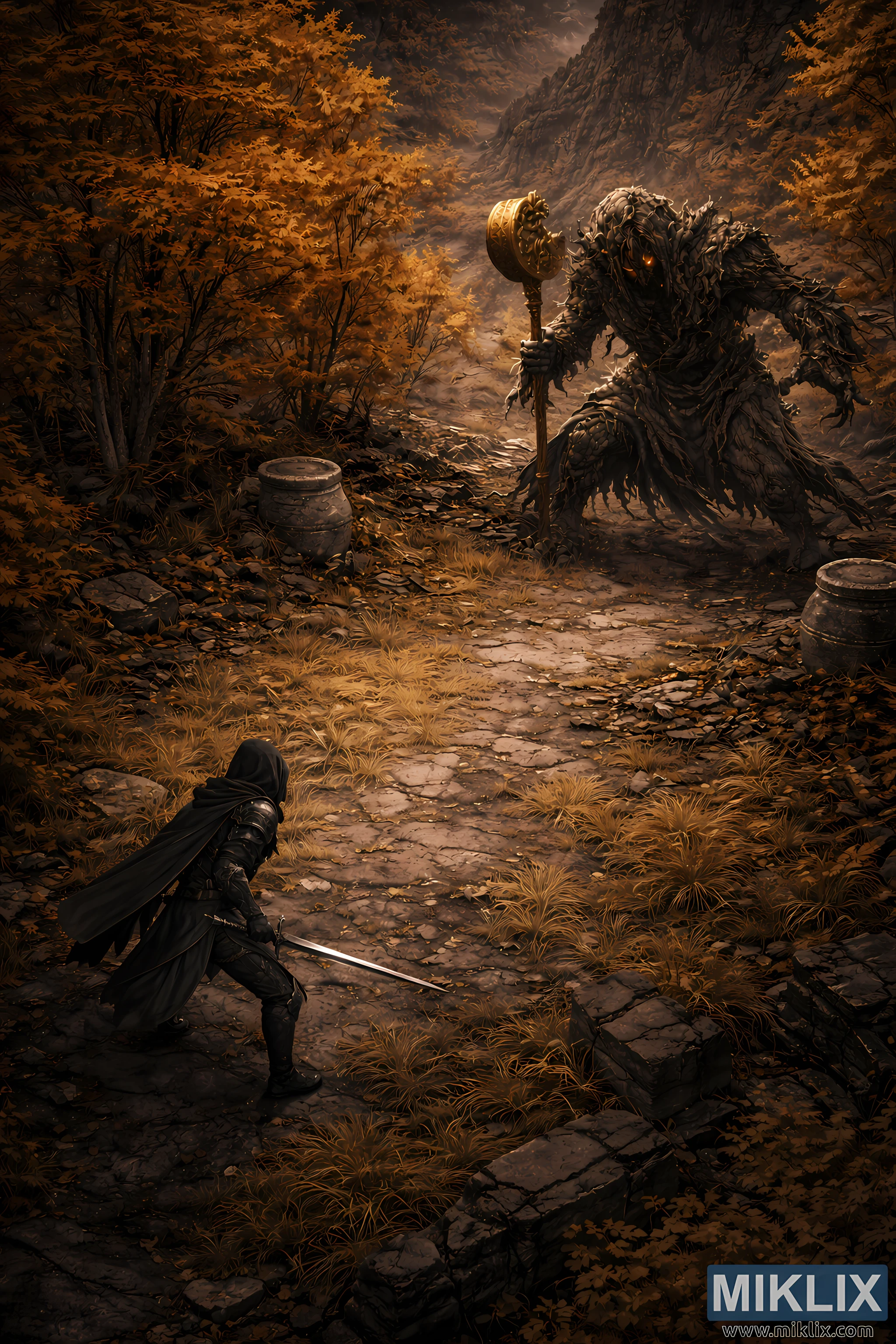 Izometrijska perspektiva pojačava osjećaj neizbježnosti i sudbine, čineći da Potamnjeli izgledaju mali u odnosu na okolinu i visokog neprijatelja. Trenutak se čini zaustavljenim u vremenu - tih, težak i zloslutan - obuhvatajući prepoznatljivu atmosferu Elden Ringa gdje svaka bitka nije samo test snage, već svečan susret s nečim drevnim, nemilosrdnim i neizbježnim.