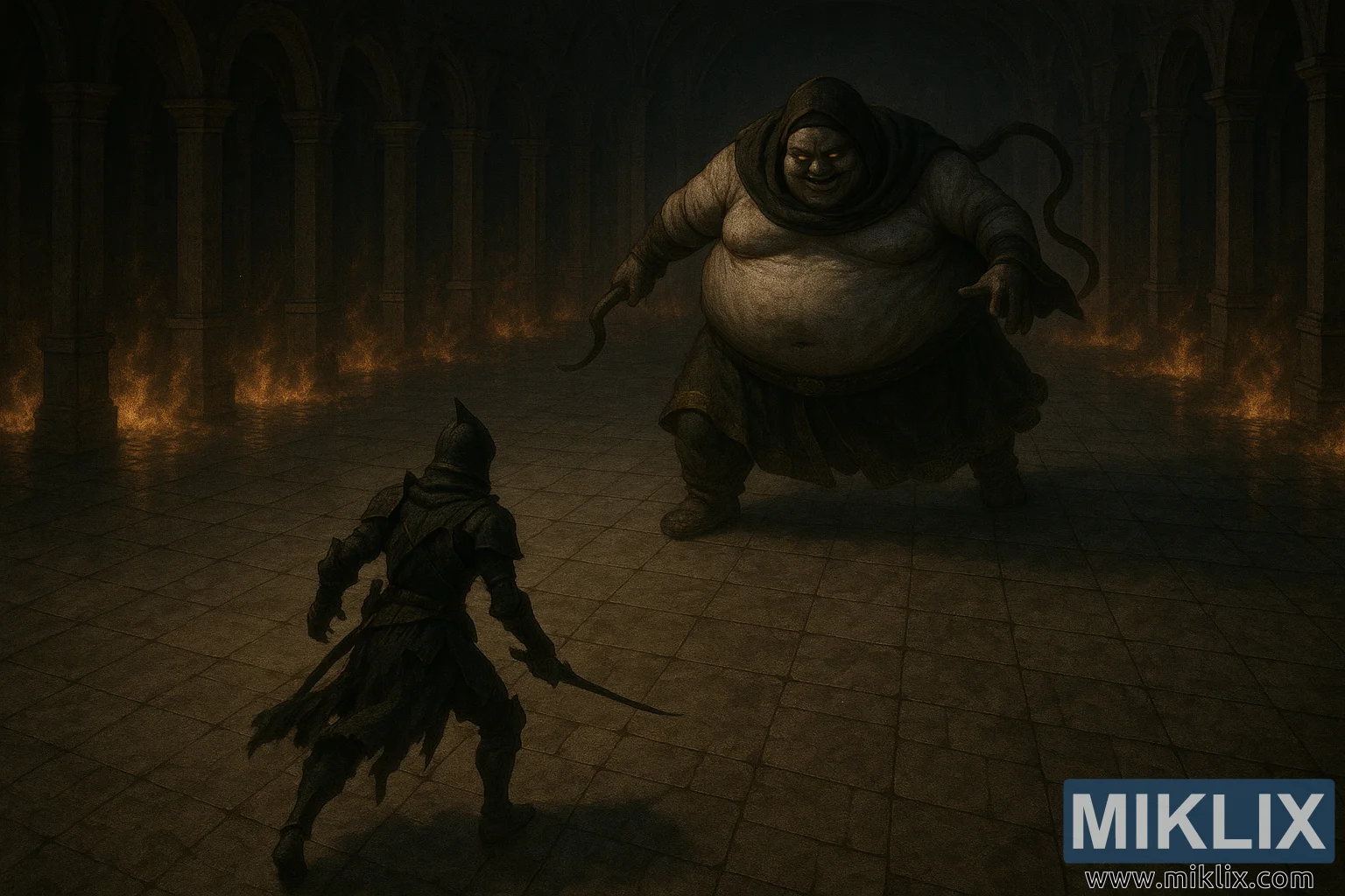 Polurealistična fan art slika Elden Ringa koja prikazuje pogled iz visokog ugla na oklop Potamnjelog u Crnom Nožu koji se suočava sa Plemićem Godskin usred plamena i kamenih lukova unutar Volcano Manora.