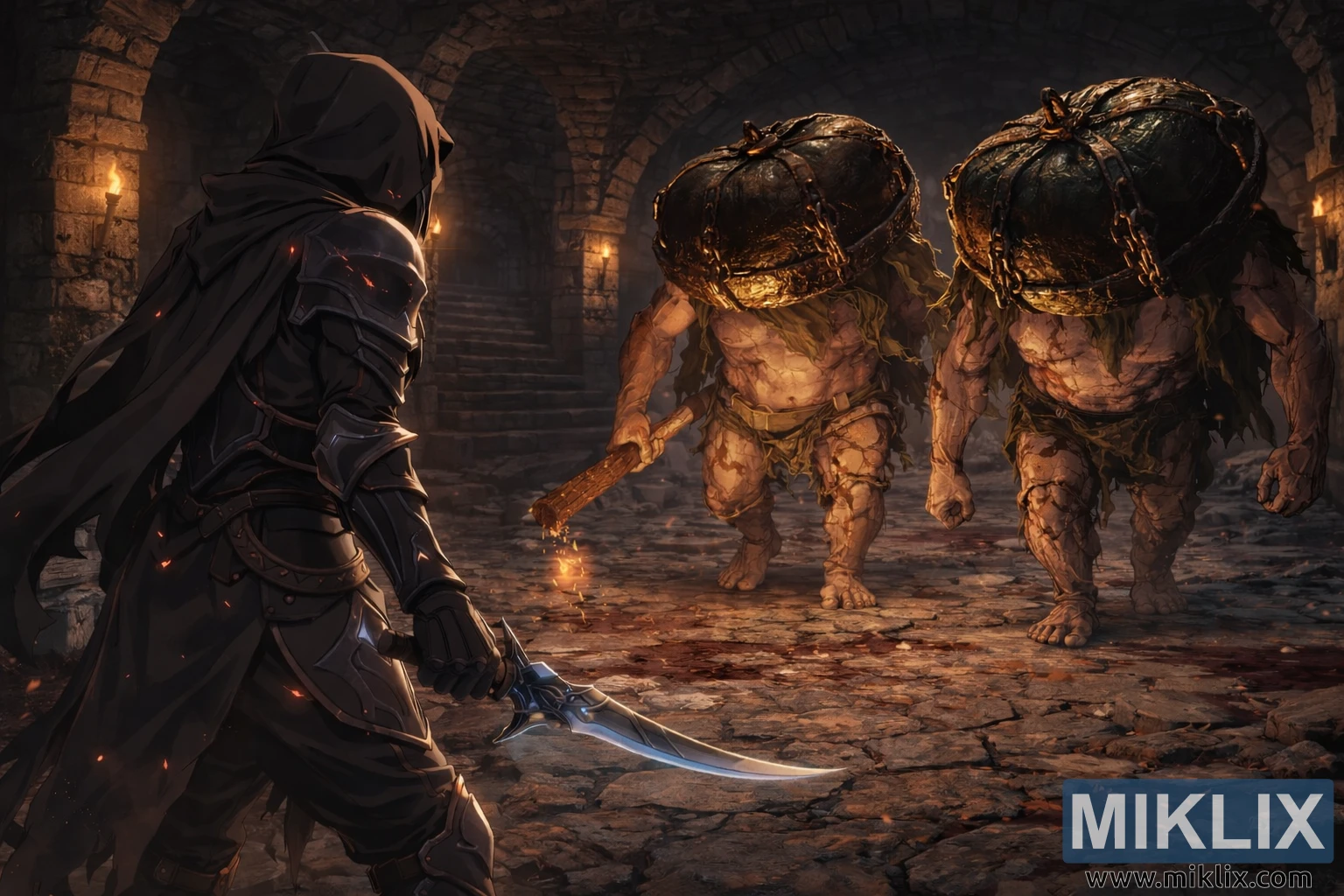 Preko ispucalog kamenog poda podruma, dva šefa Lude Pumpkin Head naziru se jedan pored drugog. Njihova masivna tijela su pogrbljena naprijed dok napreduju teškim, odlučnim koracima, svako stopalo pritišćući krvlju umrljane kamene ploče. Glave su im obavijene grotesknim, prevelikim kacigama u obliku bundeve, okovanim debelim lancima, metalne površine su izgrebane, udubljene i tupe od bezbrojnih bitaka. Jedno od čudovišta steže grubu drvenu toljagu koja još uvijek kaplje užareni žar na pod, ostavljajući slab trag iskri u ustajalom zraku. Njihova izložena tijela su mišićava i prekrivena ožiljcima, s poderanom tkaninom koja labavo visi sa njihovih strukova, naglašavajući njihovo brutalno, gotovo divlje prisustvo.
