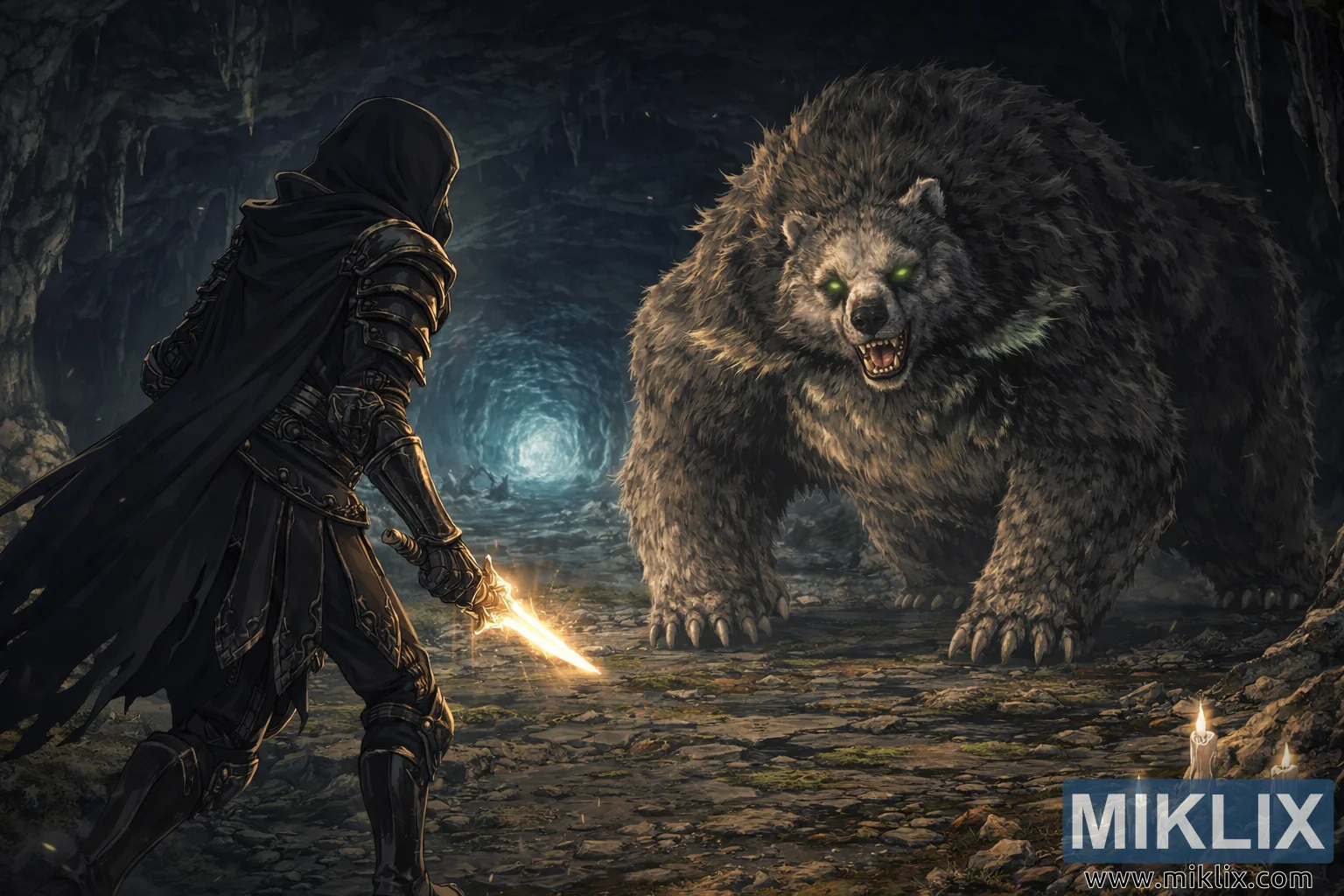 Filmska ilustracija u anime stilu fantazije koja prikazuje napeti obračun prije bitke između Potamnjelog u oklopu Crnog Noža i masivnog Runebeara unutar slabo osvijetljene podzemne pećine.