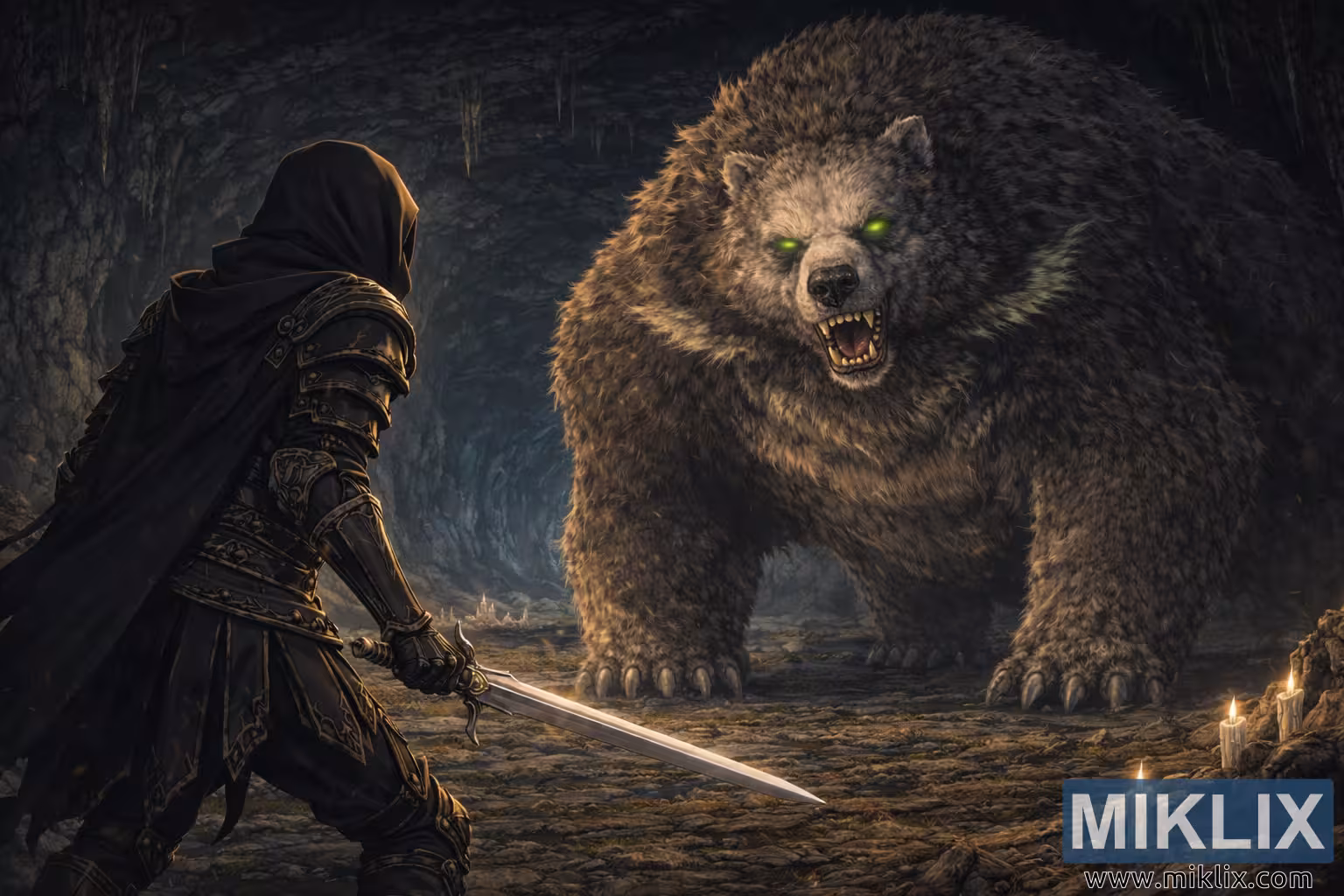 Desnom polovinom kadra dominira kolosalni Runski Medvjed čija ogromna veličina nadmašuje i ratnika i veći dio okolne pećine. Masivna ramena zvijeri gotovo dodiruju neravni strop, a njeno gusto krzno je prikazano gustim, teksturiranim potezima koji miješaju nijanse smeđe, sive i prigušene maslinastozelene. Njegovo držanje je nisko i čvrsto, prednje noge teško su zabijene u tlo s ogromnim kandžama koje se zabijaju u kamen, prenoseći sirovu snagu i neizbježno kretanje. Runske Medvjedovi sjajni zeleni pogledi intenzivno sjaje kroz prigušeno okruženje, postajući neposredne žarišne točke koje probijaju tamu i pojačavaju osjećaj opasnosti. Njegove čeljusti su djelomično otvorene, otkrivajući oštre zube i tiho režanje koje sugerira upozorenje, a ne trenutni napad, zamrzavajući stvorenje u trenutku zastrašujućeg suzdržavanja. Razlika u veličini između Potamnjelog i zvijeri stvara snažnu vizualnu neravnotežu koja pojačava napetost i iščekivanje.