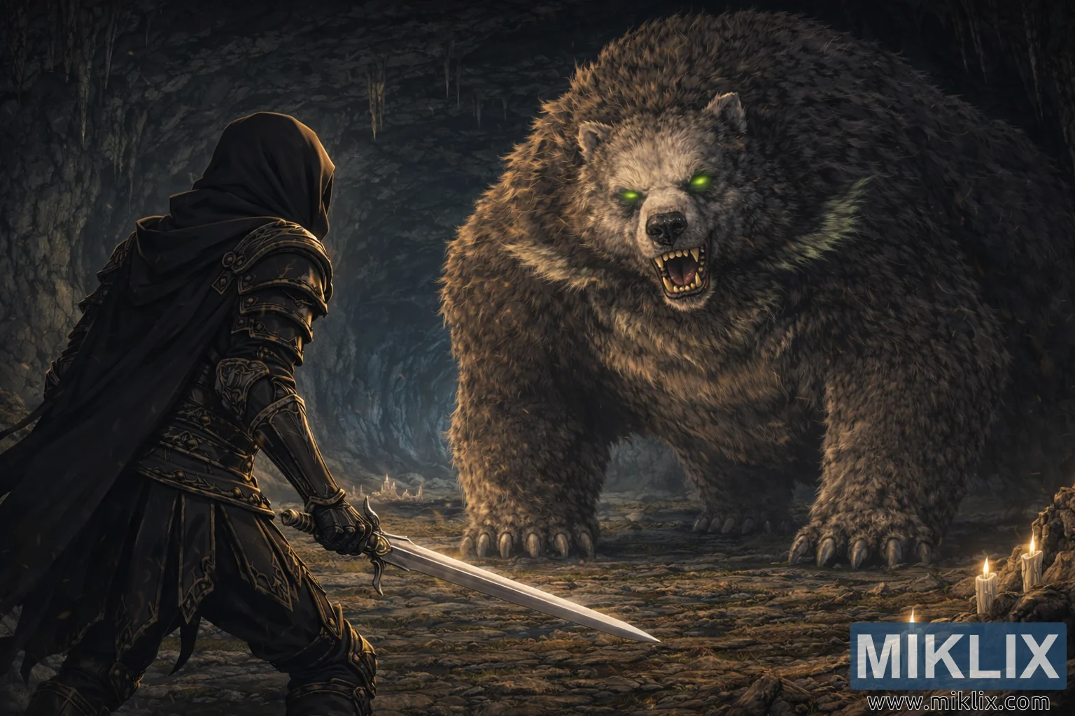 Okruženje pećine bogato je atmosferskim detaljima. Nazubljeni stalaktiti vise sa stropa dok se grubi kameni zidovi zakrivljuju prema unutra, formirajući prirodni tunel koji uokviruje sukob poput pozorišne pozornice. Tanke zrake hladne plavkaste svjetlosti filtriraju se iz udaljenih otvora dublje u pećini, u kontrastu s toplim ćilibarnim sjajem malih svijeća postavljenih u blizini stijena i izbočina duž prednjeg plana. Ove svijeće bacaju meke, plesne odsjaje po neravnom tlu, osvjetljavajući razasute kamenčiće, pukotine i suptilne mrlje mahovine koje daju taktilni realizam fantastičnom okruženju. Fine čestice prašine lebde zrakom, hvatajući zalutale zrake svjetlosti i poboljšavajući percepciju dubine. Ukupna paleta boja spaja duboke tamnoplave, ugljenocrne, zemljano smeđe i tople zlatne akcente, stvarajući tmurnu, ali skladnu vizualnu ravnotežu. Oštre anime linije se besprijekorno stapaju sa slikarskim tehnikama sjenčanja, dajući ilustraciji i stiliziranu eleganciju i impresivnu dubinu. Kompozicija hvata tačan ritam srca prije početka borbe, gdje se tišina proteže između discipline i grube sile. Potamnjeli utjelovljuje agilnost, preciznost i odlučnost, dok Runebear predstavlja neodoljivu iskonsku moć. Svjetlost, razmjer i perspektiva se stapaju kako bi stvorili napet osjećaj iščekivanja, kao da gledalac svjedoči posljednjem dahu prije neizbježnog sukoba u epskoj mračnoj fantastičnoj sagi.
