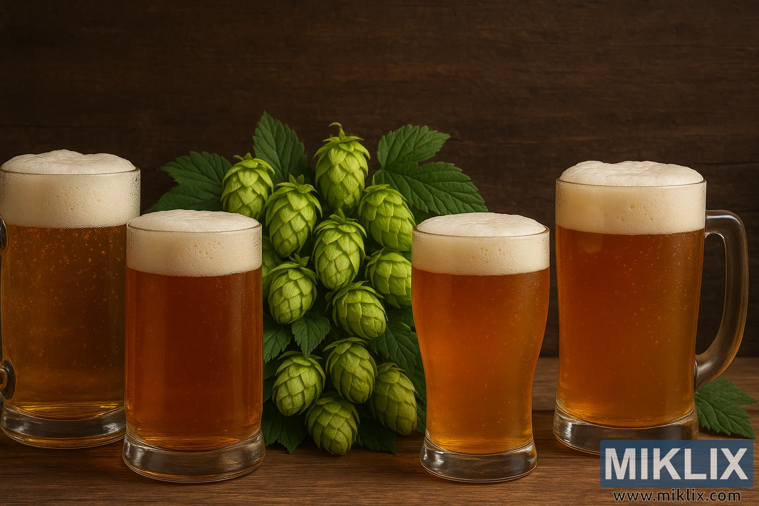 Linija zlatnožutih ale piva uparenih sa svježim Cascade hmeljem na rustikalnoj drvenoj pozadini, ističući cvjetne, citrusne i borove note ovog kultnog hmelja.