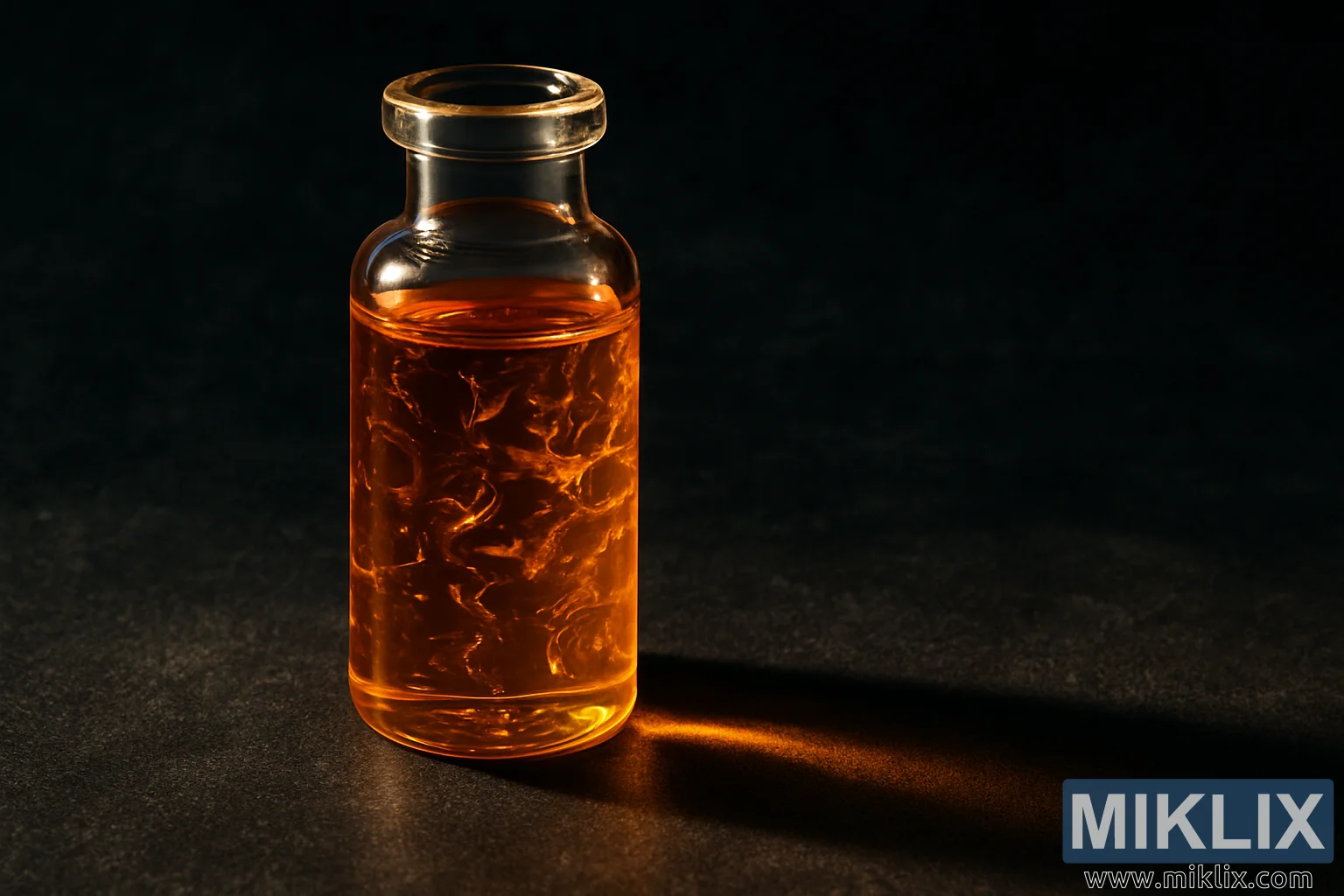 Površina ispod bočice ima prigušenu, gotovo kamenu teksturu, dodajući kompoziciji prizemljenu materijalnost. To je u kontrastu s besprijekornom glatkoćom stakla, pojačavajući percepciju bočice kao kontroliranog, naučnog objekta. Dramatična sjena proteže se dijagonalno od dna bočice, duga i oštro definirana, blago obojena jantarnim nijansama od sjajnog ulja unutra. Ova interakcija između sjene i osvjetljenja ne samo da dodaje dubinu sceni, već i naglašava dramatične i tehničke kvalitete subjekta. Ugao i doseg sjene daju kompoziciji osjećaj ravnoteže, stvarajući harmoniju između svjetla i tame, a istovremeno održavajući fokus na centralnom objektu.