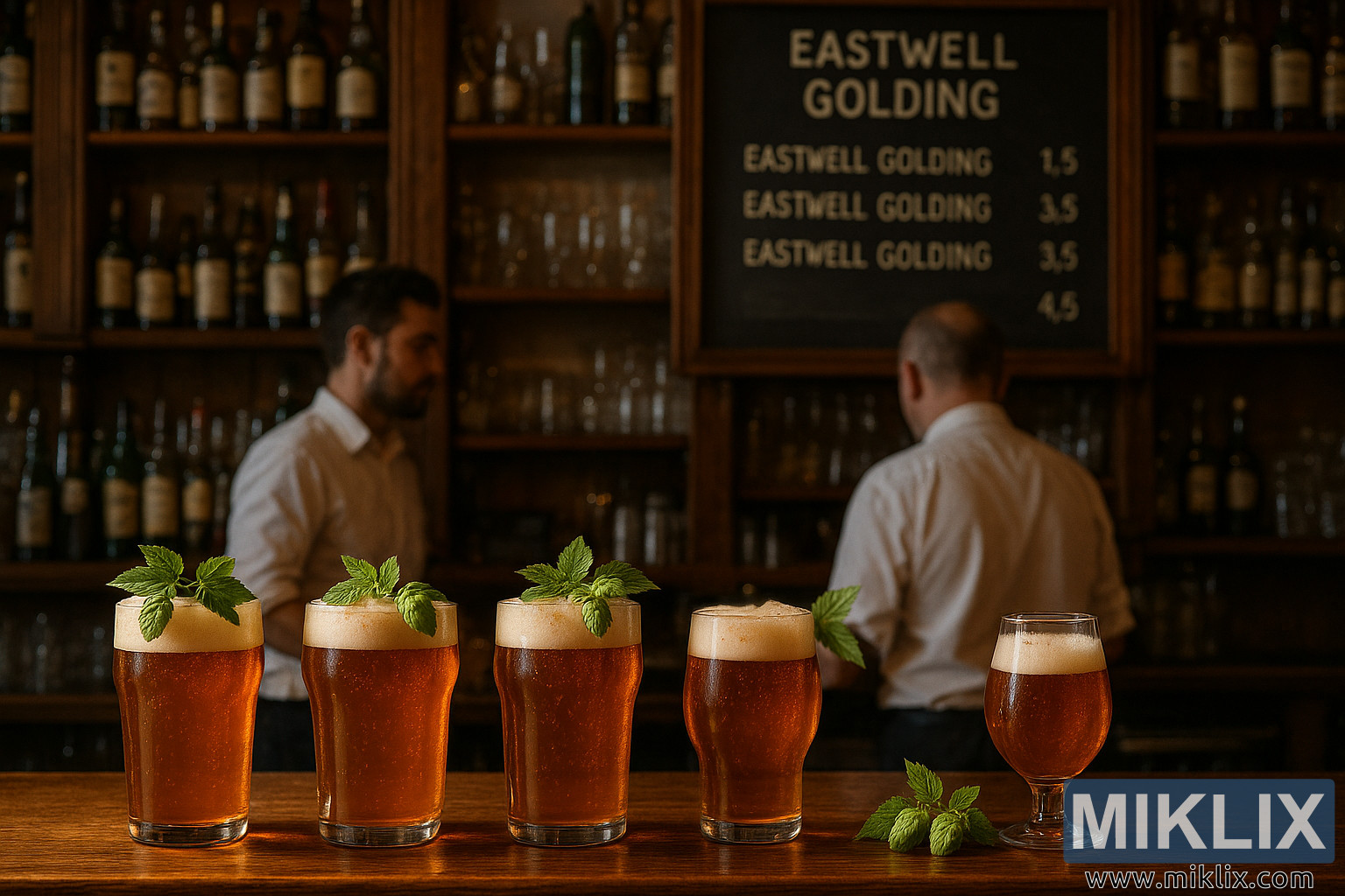 Topla, privlačna unutrašnjost paba s pivima boje jantara kuhanim s hmeljem Eastwell Golding, ukrašenim svježim hmeljem, barmenima u bijelim košuljama i pivskim menijem ispisanim kredom.