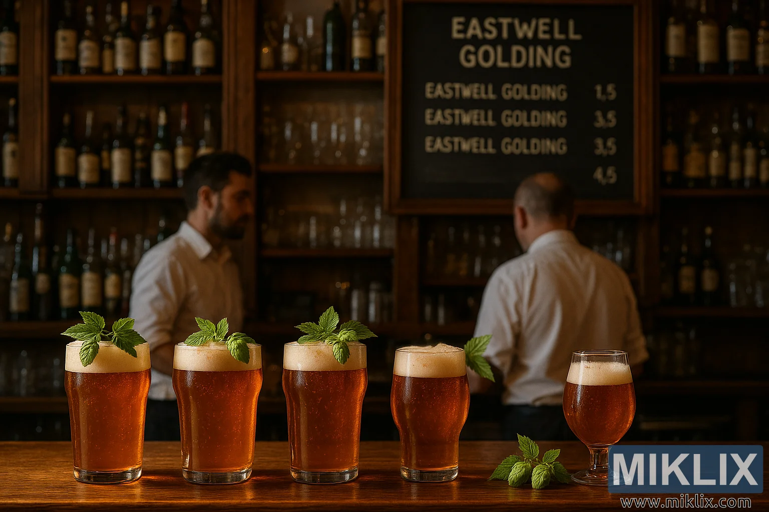 Slika prikazuje privlačnu atmosferu tradicionalnog puba, uhvaćenu u toplim, zlatnim tonovima koji naglašavaju udobnost i druželjubivost. Kompozicija se fokusira na polirani drveni šank, čija glatka površina reflektuje sjaj blagog osvjetljenja. Na šanku je istaknuto izloženo nekoliko čaša piva boje ćilibara, svaka okrunjena pjenastom glavom. Ono što razlikuje ova piva je ukras od svježih grančica hmelja Eastwell Golding, nježno postavljenih na čaše, a njihovi jarko zeleni listovi pružaju upečatljiv kontrast u odnosu na ćilibarne nijanse tekućine. Ovaj hmelj, poznat po svojoj prepoznatljivoj aromi i pivarskoj baštini, dodaje vizualni i simbolični podsjetnik na vještinu uključenu u proizvodnju pića.