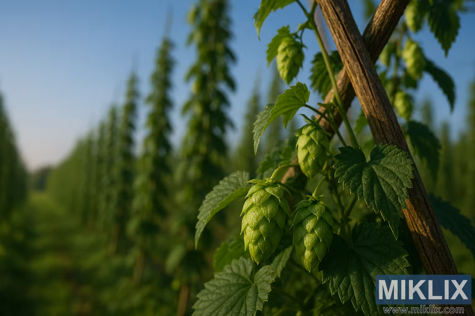 Pozadina je blago zamućena, otkrivajući suncem okupano polje hmelja koje se proteže u daljinu. Redovi biljaka hmelja povlače se prema horizontu pod vedrim plavim nebom, koje je u prekrasnom kontrastu sa zelenim lišćem. Topla, zlatna sunčeva svjetlost probija se s desne strane kadra, bacajući nježne sjene i osvjetljavajući hmelj i lišće mekim sjajem.