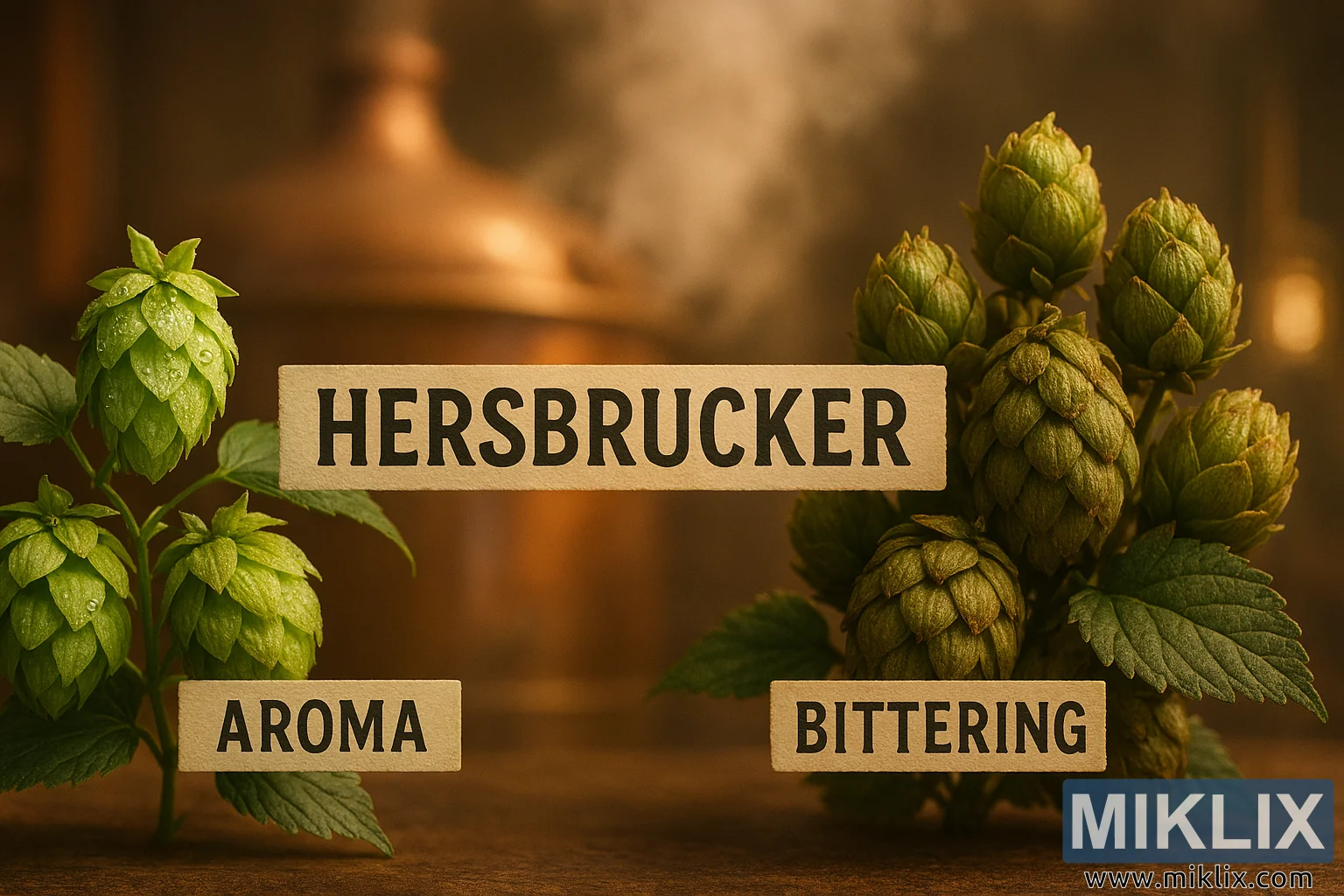 Između dva skupa, bež baner se proteže horizontalno preko slike, na kojem je podebljano, velikim slovima ispisana riječ 'HERSBRUCKER' u crnoj boji. Manji baneri ispod svakog skupa glase 'AROMA' i 'BITTERING', jasno označavajući kontrastne uloge.