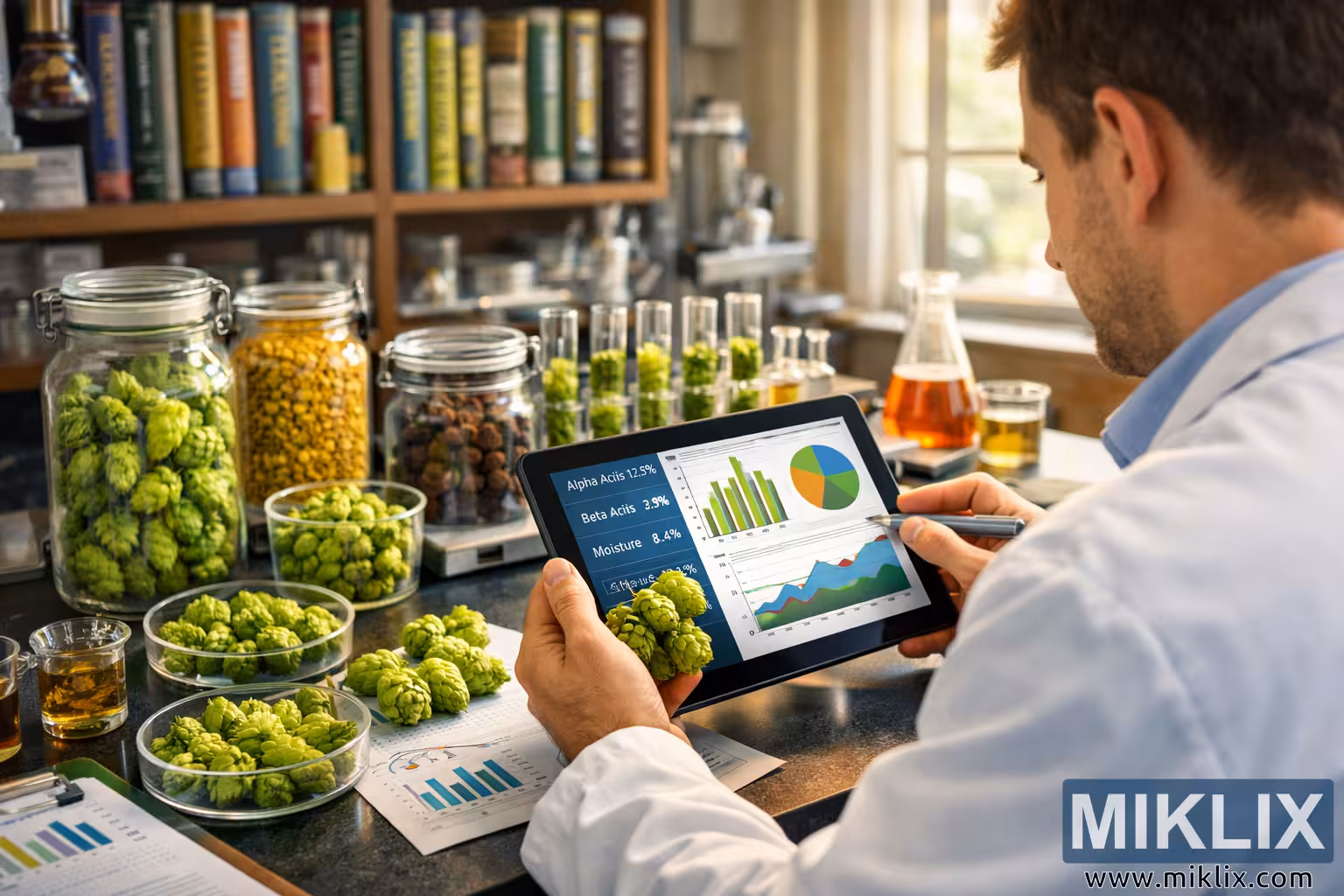 Slika predstavlja vizualno privlačnu i pedantno detaljnu scenu smještenu u istraživačkom laboratoriju za pivo, dizajniranu da prenese pažljivu analizu i naučnu dubinu koja stoji iza interpretacije podataka o hmelju. U prvom planu, istraživač u oštrom bijelom laboratorijskom mantilu sjedi za čvrstim laboratorijskim stolom, postajući jasna centralna tačka kompozicije. Istraživač u jednoj ruci drži svježu zelenu šišarku hmelja dok drugom pažljivo ispituje digitalni tablet, odražavajući spoj tradicionalnog poljoprivrednog znanja i moderne analize zasnovane na podacima. Ekran tableta prikazuje jasne, šarene grafikone i dijagrame, uključujući stupčaste grafikone, linijske grafikone i tortne grafikone koji predstavljaju karakteristike hmelja kao što su alfa kiseline, beta kiseline, sadržaj vlage i ukupni sastav. Jasnoća vizualizacije podataka naglašava preciznost, mjerenje i informirano donošenje odluka.