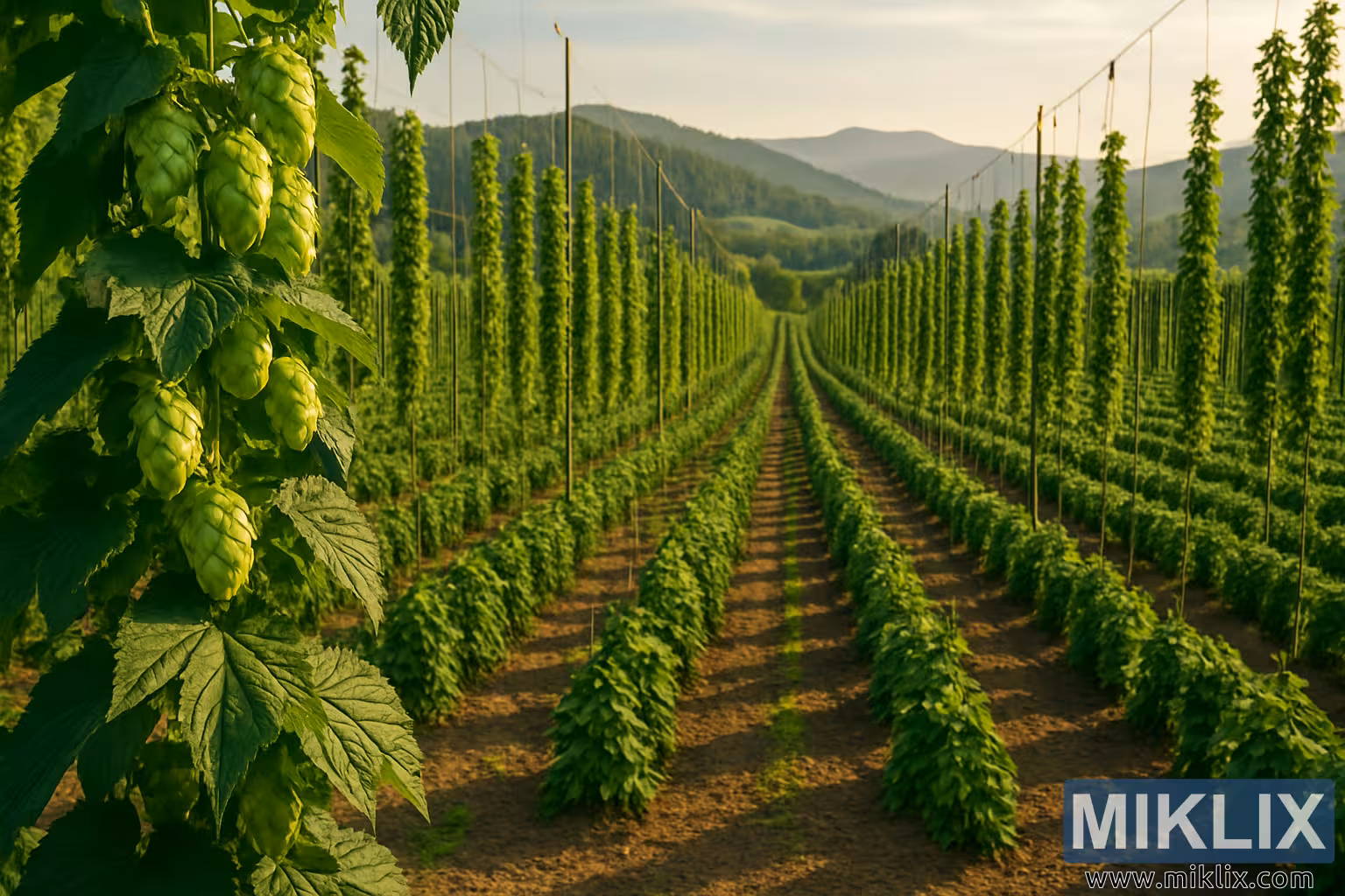 Odmah iza ovog krupnog plana, središnji dio zemljišta otvara se u duge, pedantno održavane redove biljaka hmelja koji se simetrično protežu u daljinu. Hmelj se penje uz visoke rešetke poduprte vitkim stupovima, formirajući ritmični uzorak vertikalnih linija. Popodnevno svjetlo ističe urednu geometriju farme, s naizmjeničnim trakama sjene i sunca koje prate redove. Tlo između biljaka djeluje pažljivo njegovano, doprinoseći osjećaju namjerne obrade i sezonskog obilja.