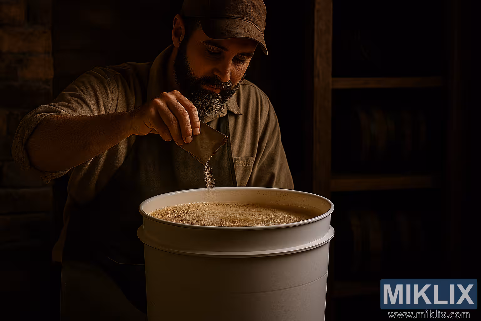 Toplo osvijetljenom, rustikalnom prostoru za kućno pivarstvo, fotografija prikazuje miran, ali ključan trenutak u procesu kuhanja piva: kućnog pivara koji stavlja suhi kvasac u kantu za fermentaciju napunjenu svježe skuhanom sladovinom. Scena je prožeta zemljanim tonovima i šarmom starog svijeta, evocirajući duh tradicionalnog zanatstva.