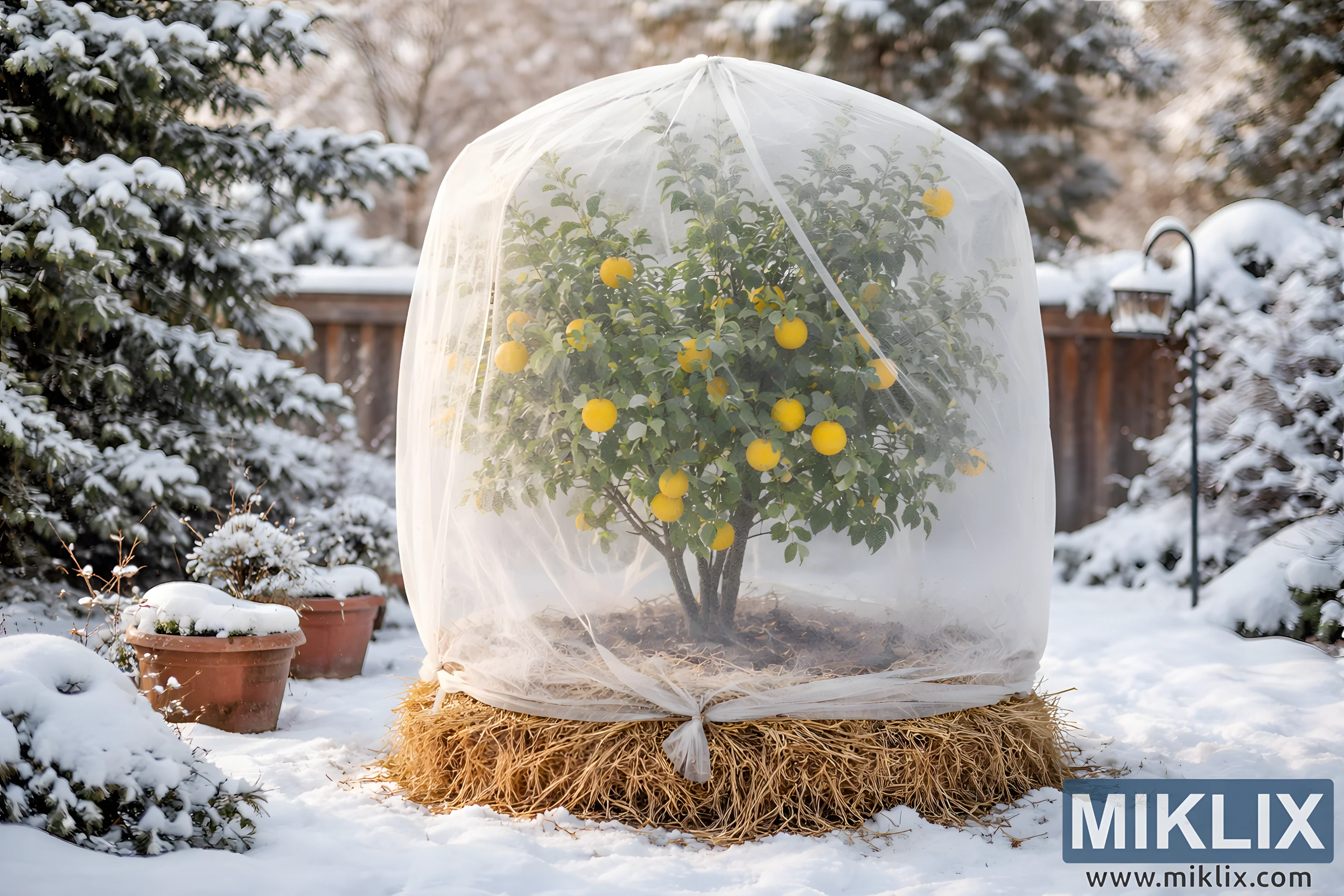 Slika prikazuje mirnu zimsku baštu u čijem je središtu limunovo drvo koje je pažljivo zaštićeno od hladnog vremena. Drvo stoji vani u dvorištu prekrivenom snijegom i potpuno je okruženo prozirnom bijelom tkaninom za zaštitu od mraza koja formira kupolastu strukturu od vrha do tla. Kroz prozirni pokrivač, gusto zeleno lišće limunovog drveta ostaje jasno vidljivo, stvarajući upečatljiv kontrast s okolnim zimskim krajolikom. Brojni zreli limuni vise s grana, njihova svijetla, zasićena žuta boja živo se ističe naspram prigušenih bijelih, sivih i mekih zelenih tonova snježnog okruženja. Zaštitna tkanina je skupljena i pričvršćena blizu podnožja drveta, omogućavajući dovoljno prostora za cirkulaciju zraka, a istovremeno štiti biljku od mraza i snijega. Ispod pokrivača, tlo u podnožju drveta izgleda izolirano slamom ili malčem, dodajući još jedan sloj zimske zaštite i dajući podnožju topao, zemljani ton u usporedbi sa snijegom oko njega. Tlo koje okružuje drvo prekriveno je svježim snijegom, glatkim i nesmetanim, što sugerira mirno, hladno jutro ili popodne. U pozadini, zimzeleno drveće prekriveno snijegom uokviruje scenu, njihove grane teške i meke od bijelih nakupina. Drvena ograda se proteže horizontalno iza limunovog drveta, djelimično zaklonjena snježnim padavinama i dubinom polja, dodajući vrtu osjećaj zatvorenosti i privatnosti. S jedne strane, klasični vrtni fenjer uzdiže se iz snijega, doprinoseći suptilnom, domaćem detalju i nagovještavajući ljudsku brigu i prisustvo bez vidljivih ljudi. Obližnje terakota saksije, također prekrivene snijegom, pojačavaju temu vrtlarstva i sugeriraju druge biljke koje miruju za zimu. Osvjetljenje je meko i prirodno, vjerovatno dnevna svjetlost filtrirana kroz oblačno zimsko nebo, koja nježno osvjetljava mraznu tkaninu i ističe teksturu snijega, slame i lišća. Sveukupno, slika prenosi osjećaj smirenosti, otpornosti i promišljenog vrtlarstva, ilustrujući kako se tipično citrusno drvo tople klime može njegovati i očuvati čak i u hladnim zimskim uslovima.