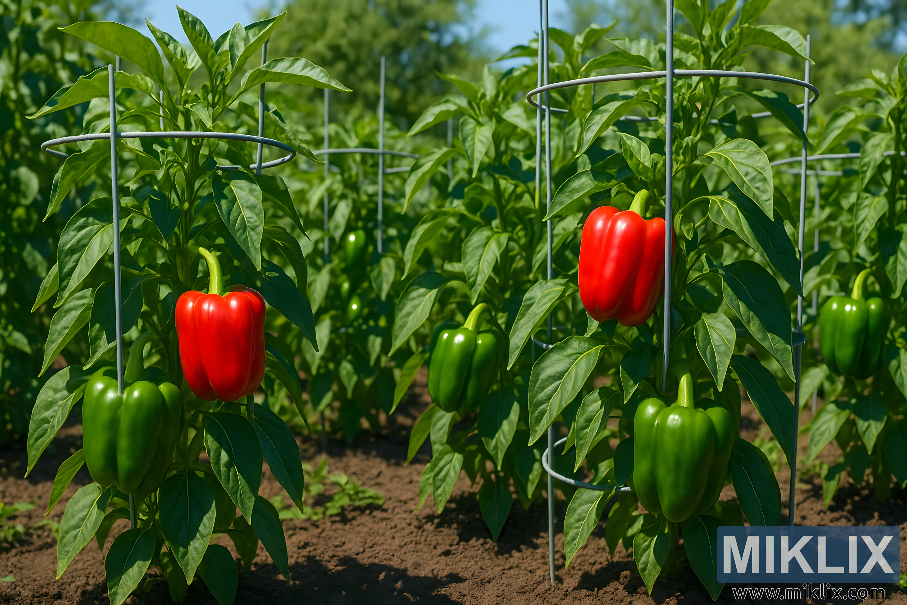 Slika prikazuje živopisan, suncem okupan vrt s redovima zdravih biljaka paprike u vrhuncu njihove vegetacijske sezone. Okupane jarkim podnevnim suncem, biljke pokazuju obilje bujnih, sjajnih zelenih listova koji stvaraju gusti krošnji nad bogatim, dobro obrađenim tlom ispod njih. Lišće izgleda gusto i snažno, što ukazuje na optimalne uvjete rasta i pažljivu njegu. Među listovima vise punašne, zrele paprike u živim nijansama crvene i tamnozelene. Njihove glatke, sjajne površine reflektiraju jaku prirodnu svjetlost, čineći ih hrskavim, svježim i gotovo spremnim za berbu. Svaku biljku podupire kavez od pocinčane čelične žice sastavljen od nekoliko kružnih prstenova povezanih vertikalnim nosačima. Ovi kavezi pomažu biljkama da ostanu uspravne i stabilne, sprječavajući da težina paprika u razvoju savije ili ošteti stabljike. Metalne konstrukcije suptilno se ističu naspram organskih oblika biljaka, formirajući ritmički uzorak kroz cijelu scenu. U pozadini, više biljaka paprike proteže se u meki fokus, sugerirajući veći vrt ili okruženje male farme. Ukupna atmosfera je topla, spokojna i puna života, hvatajući produktivnost i ljepotu dobro održavanog povrtnjaka u podne. Međuigra sunčeve svjetlosti, sjena i živih boja doprinosi prirodnom osjećaju dubine, naglašavajući zdravlje i robusnost biljaka paprike, a istovremeno ističući pedantan sistem potpore koji omogućava njihov rast.