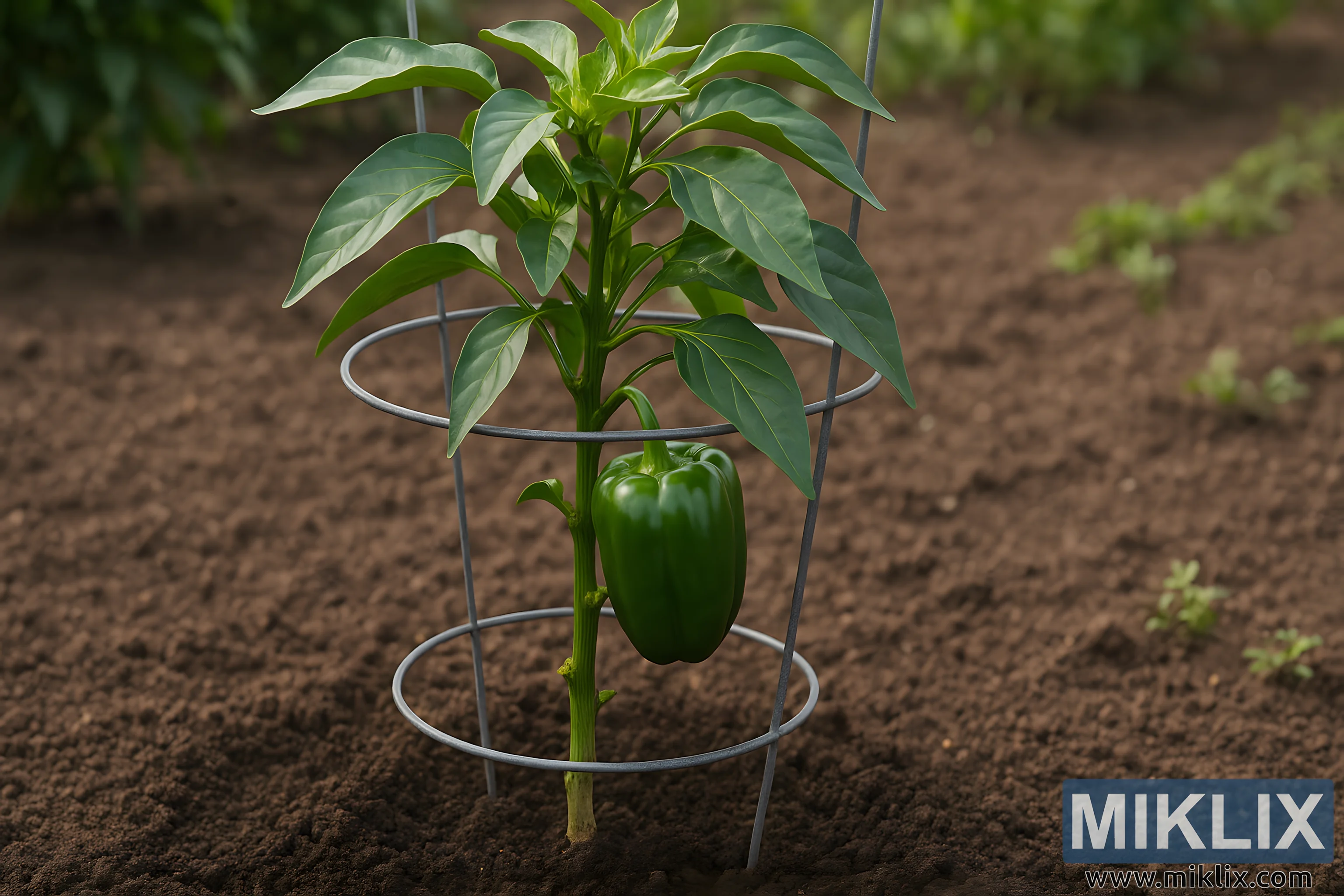 Ova slika prikazuje zdravu mladu biljku paprike koja raste u dobro održavanoj vrtnoj gredici, poduprtu metalnim žičanim kavezom dizajniranim da biljka ostane u uspravnom položaju dok sazrijeva. Tlo koje okružuje biljku je fine teksture, ravnomjerno obrađeno i bez otpada, što sceni daje organiziran i promišljen izgled tipičan za pažljivo upravljani povrtnjak. Biljka paprike ima čvrstu središnju stabljiku s pravilno orezanim donjim granama, ostavljajući donji dio čistim i otvorenim kako bi se poboljšao protok zraka i smanjio rizik od bolesti koje se prenose tlom. Ovo orezivanje također pomaže biljci da usmjeri svoju energiju na razvoj snažnog gornjeg lišća i proizvodnju plodova. Jedna, sjajna zelena paprika visi s jedne od grana srednjeg nivoa, izgledajući čvrsto, glatko i lijepo oblikovano. Listovi su jarko zeleni sa zdravim sjajem, ne pokazuju znakove promjene boje ili štetočina. Metalni kavez okružuje biljku ravnomjerno raspoređenim prstenovima koji pružaju potporu kako biljka raste i počinje nositi veću težinu od više plodova. Pozadina je blago zamućena, sa suptilnim mrljama zelenila koje ukazuju na dodatne biljke ili redove vrta izvan fokusnog područja. Prirodno dnevno svjetlo osvjetljava scenu, bacajući meke sjene i ističući teksturu i oblik biljke. Sveukupno, slika prenosi osjećaj pravilne njege vrta, prikazujući efikasno oblikovanje biljaka, tehnike orezivanja i strukturnu podršku za optimalan rast paprike.