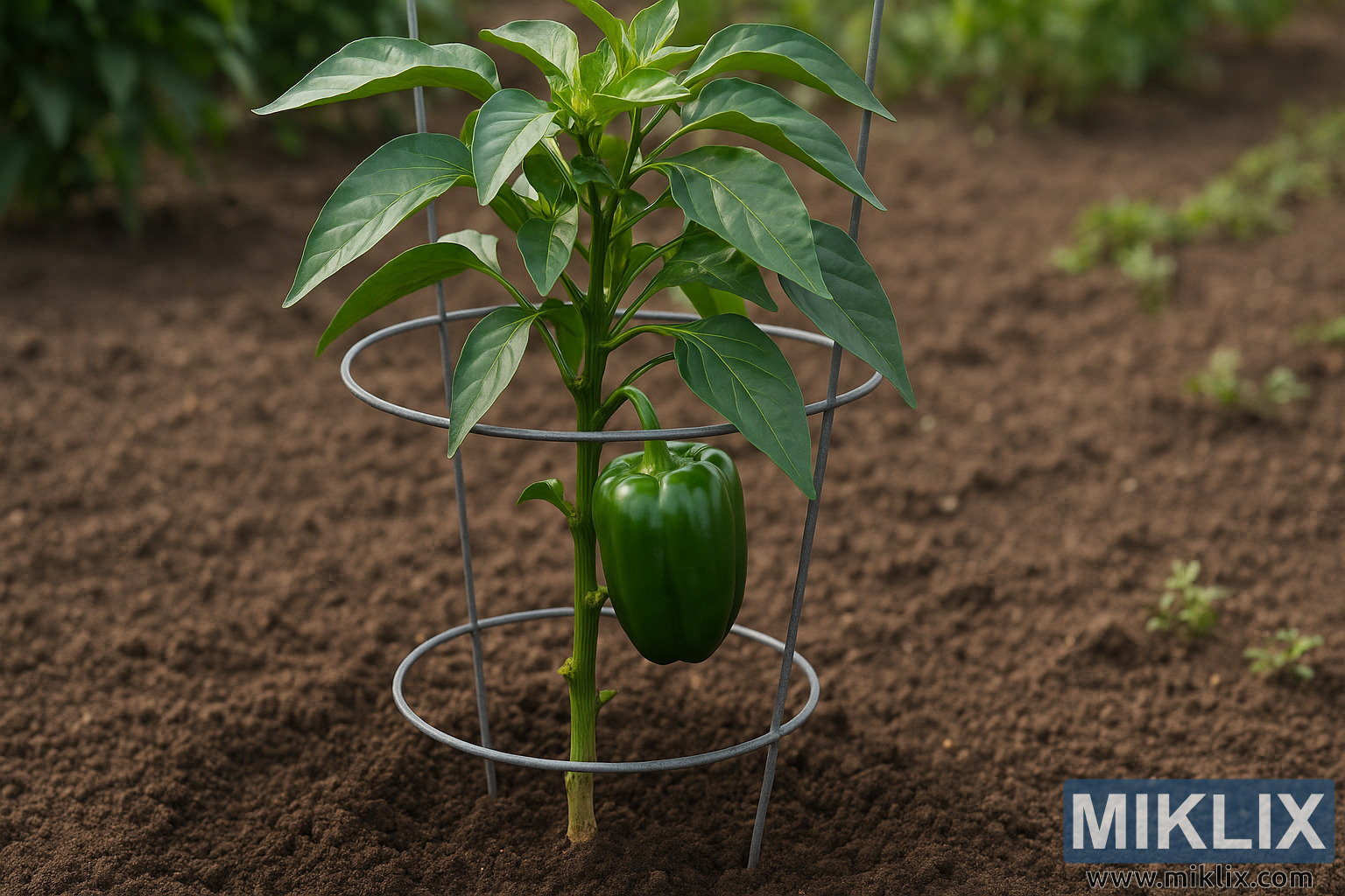 Zdrava biljka paprike koja raste s pravilnom potporom u kavezu i orezanim donjim granama, prikazana u dobro održavanoj vrtnoj gredici.