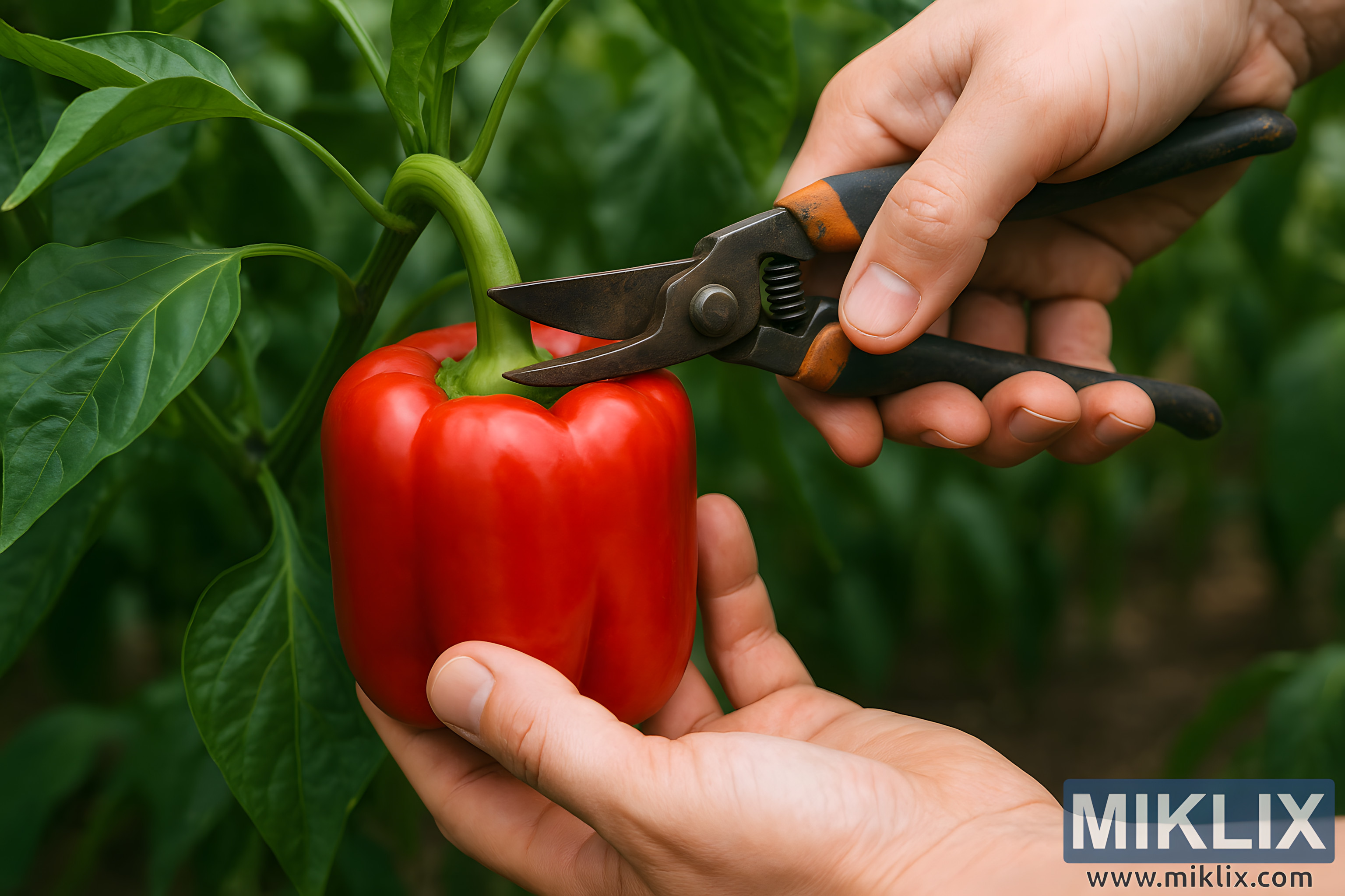 Kadru su vidljive dvije ruke koje rade zajedno kako bi odvojile papriku. Jedna ruka nježno pridržava donji dio paprike, stabilizirajući je i sprječavajući naprezanje biljke. Boja kože ruke sugerira prirodno, vanjsko radno okruženje, a prsti su opušteni, ali i potporni, postavljeni tako da papriku drže stabilnom. Druga ruka drži par dobro korištenih škara za orezivanje. Škare imaju tamnu metalnu površinu za rezanje i ergonomske drške s istrošenim mrljama, što ukazuje na čestu upotrebu u vrtlarstvu. Oštrice su djelomično otvorene i precizno postavljene u podnožju stabljike paprike, spremne za čist rez.