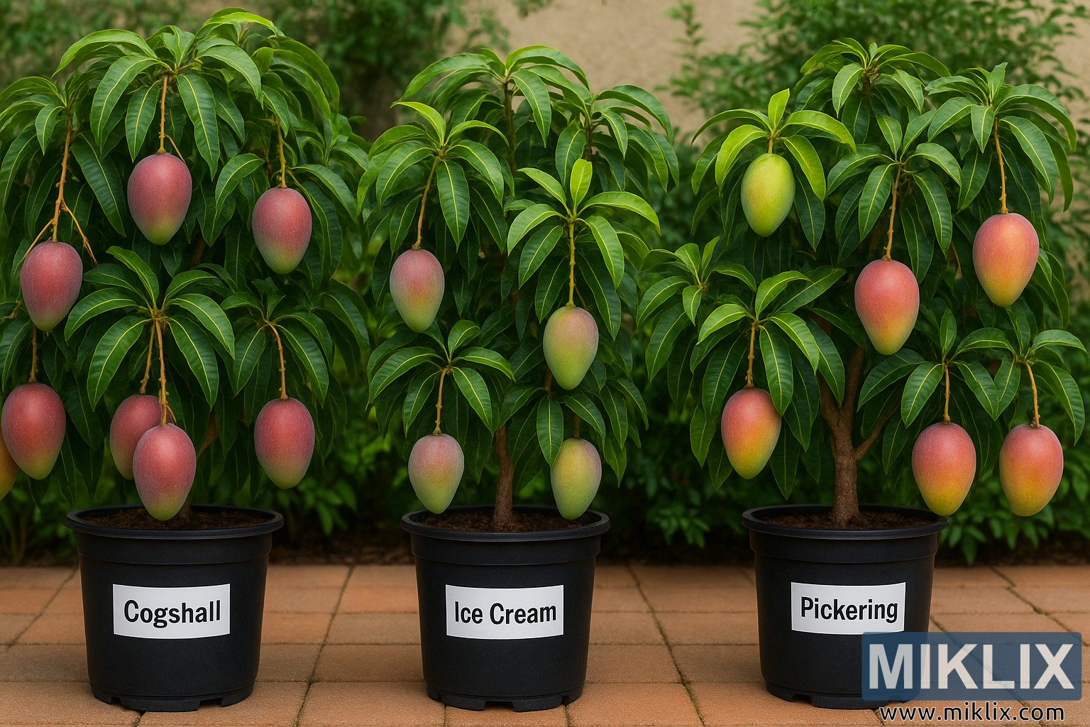 Slika prikazuje tri kompaktna patuljasta stabla manga, koja predstavljaju sorte 'Cogshall', 'Ice Cream' i 'Pickering', a svako od njih uspijeva u crnim plastičnim posudama uredno raspoređenim na terasi obloženoj terakota pločicama. Ambijent izgleda kao mali vrt ili dvorište okruženo bujnim zelenim lišćem i bež štukaturnim zidom koji pruža neutralnu pozadinu, omogućavajući da se bogate boje biljaka i plodova živo istaknu. Svaka posuda ima otisnutu bijelu etiketu s podebljanim crnim tekstom koji identificira naziv kultivara, čineći izložbu i edukativnom i vizualno organiziranom.